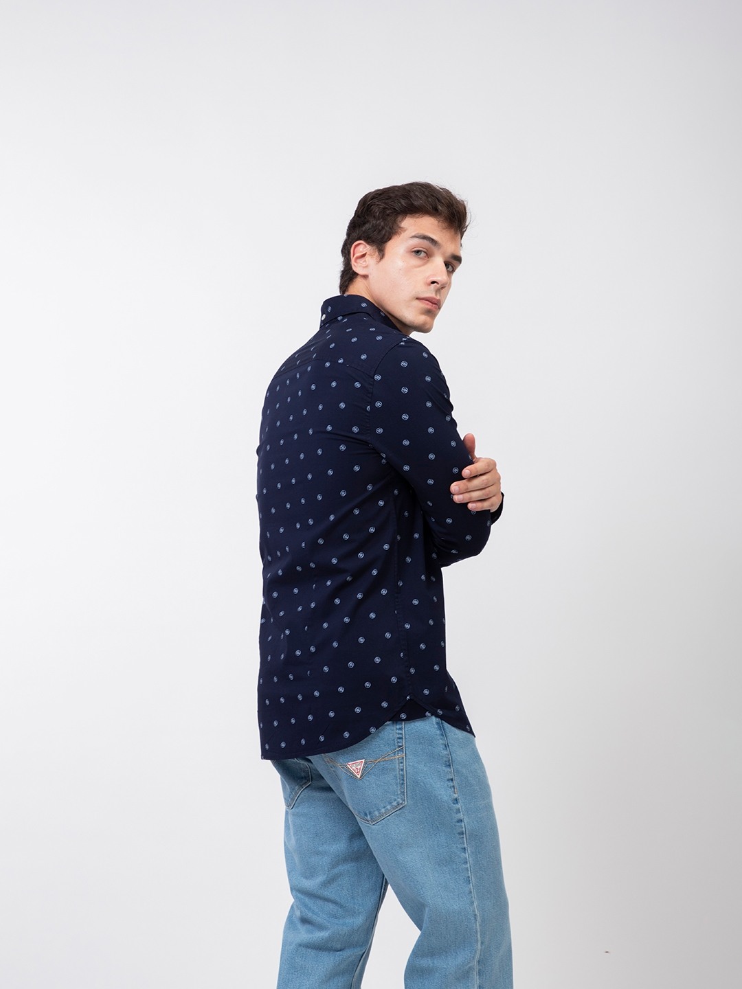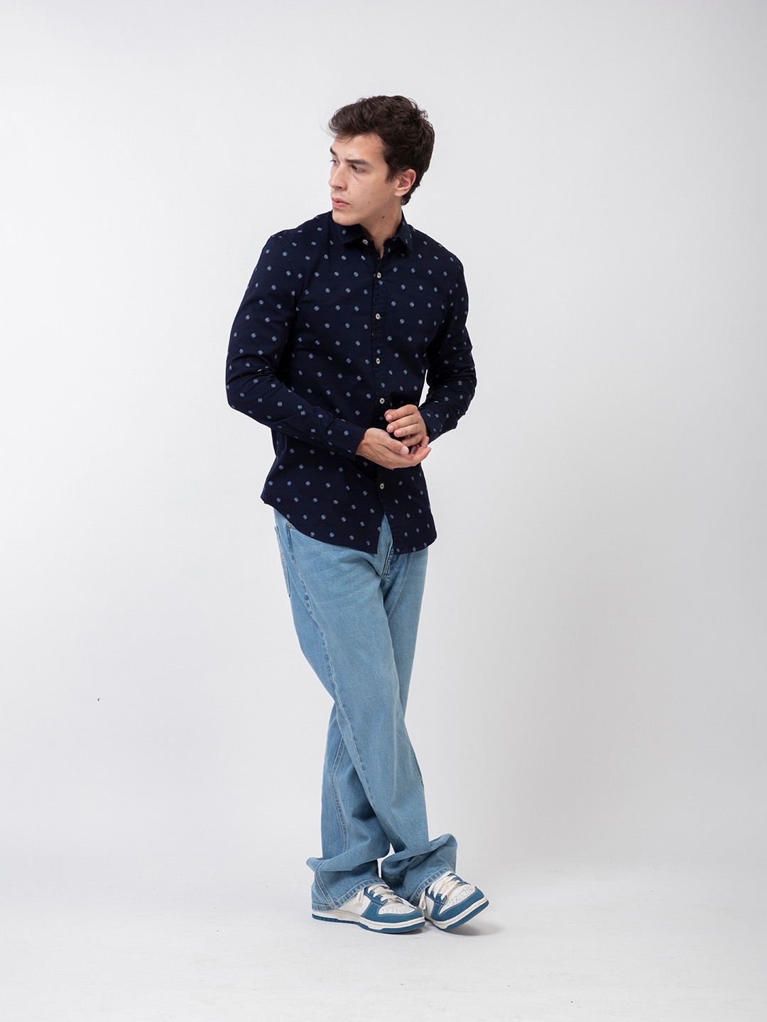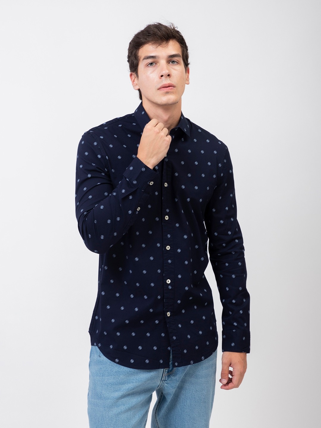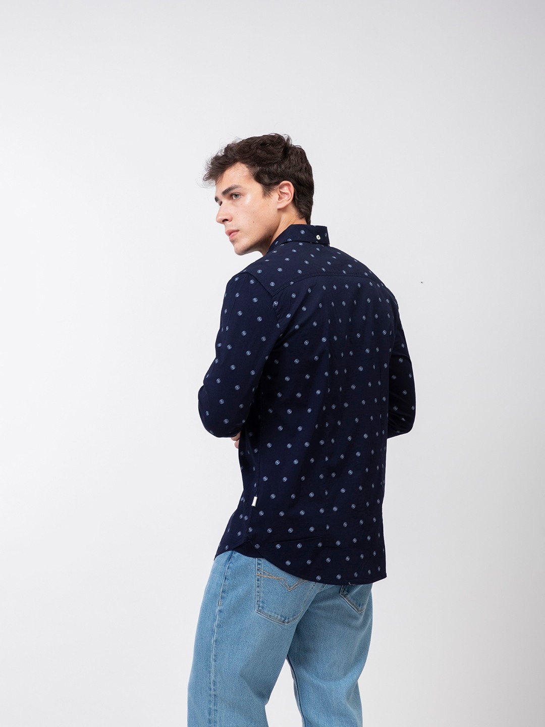 Navy Blue Printed Spread Collar Full Sleeve Shirt