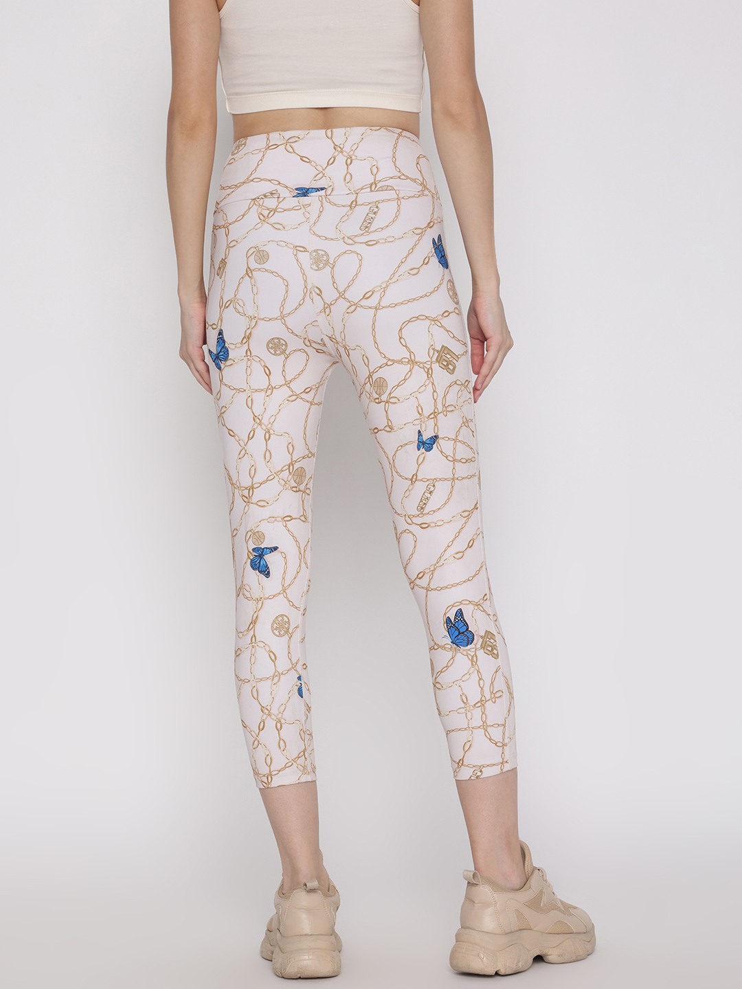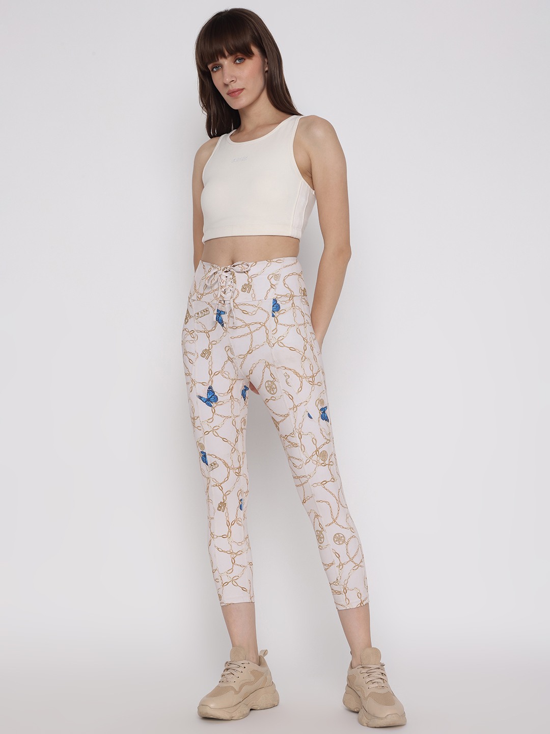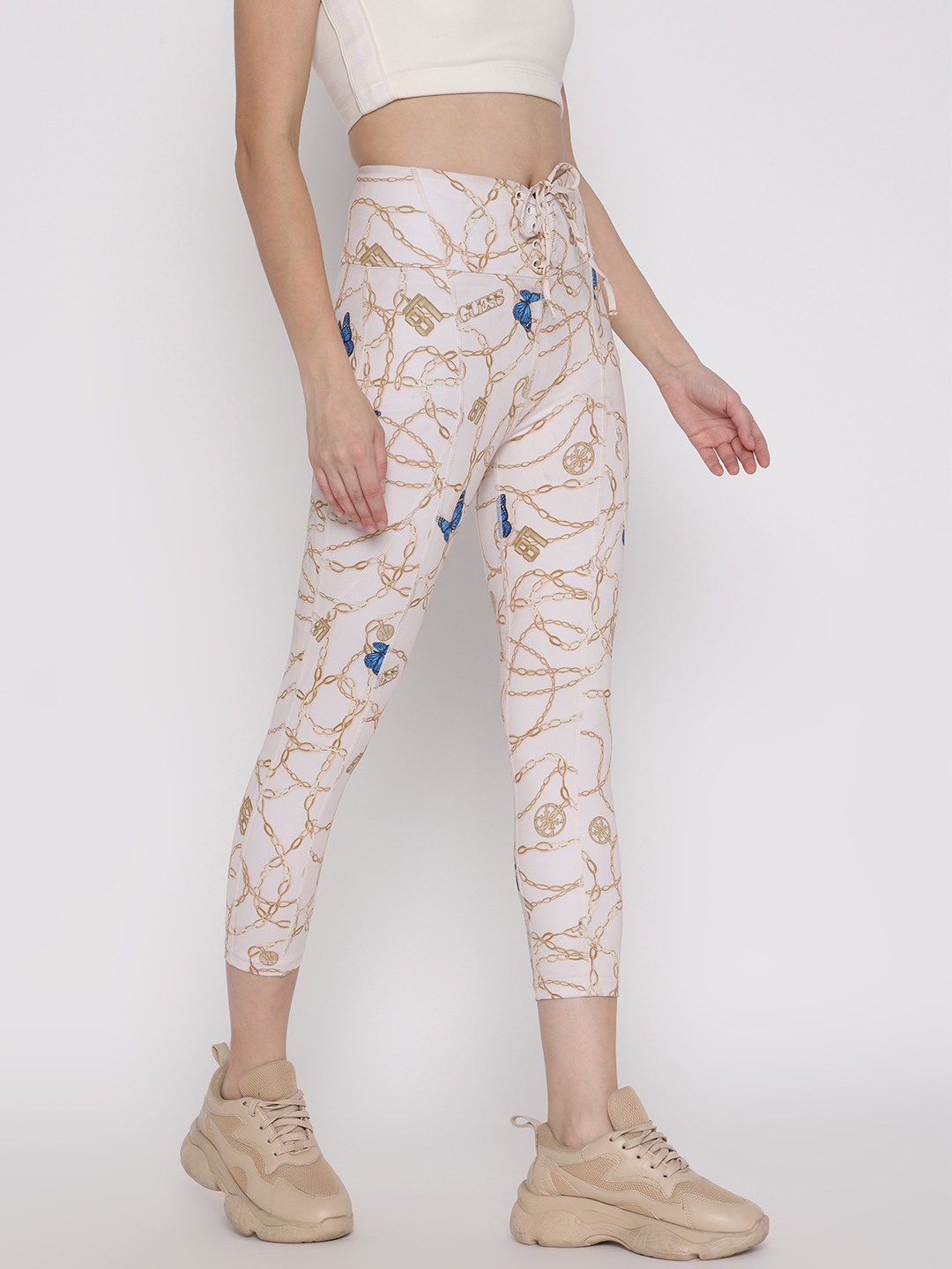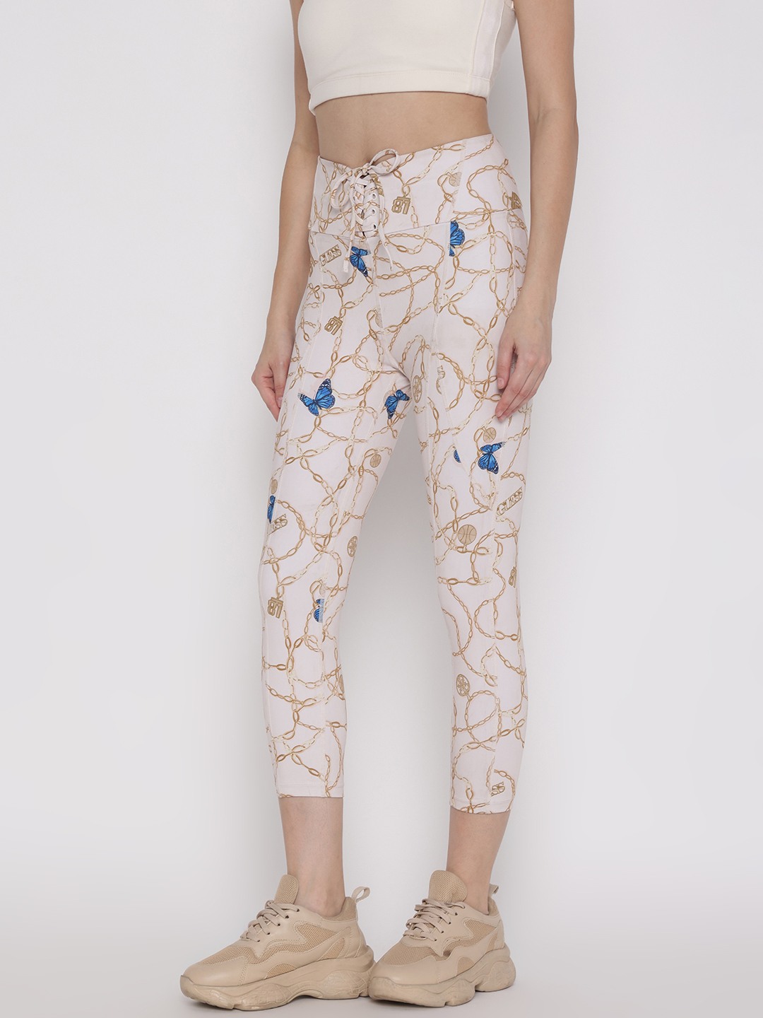 Discover the perfect blend of style and comfort with our off-white skinny fit leggings. Designed for the modern woman, these leggings feature a chic printed pattern that adds a touch of elegance to any outfit. The mid-rise design ensures a flattering fit, while the tie-up closure offers a customizable fit for all-day comfort. Crafted from a premium blend of 75% polyester and 25% elastane, these leggings provide excellent stretch and durability. Ideal for casual outings or a relaxed day at home, they effortlessly combine fashion and function.