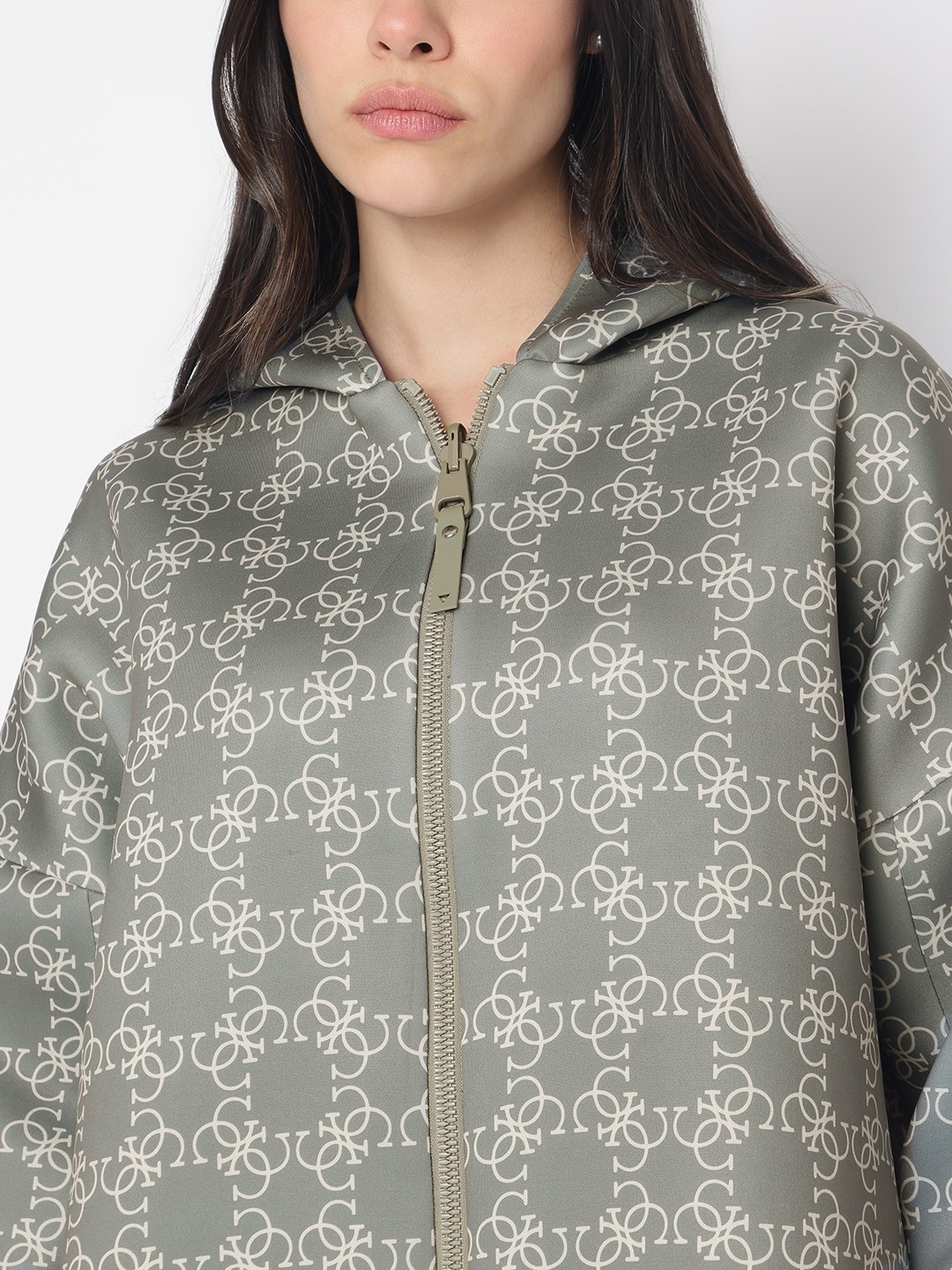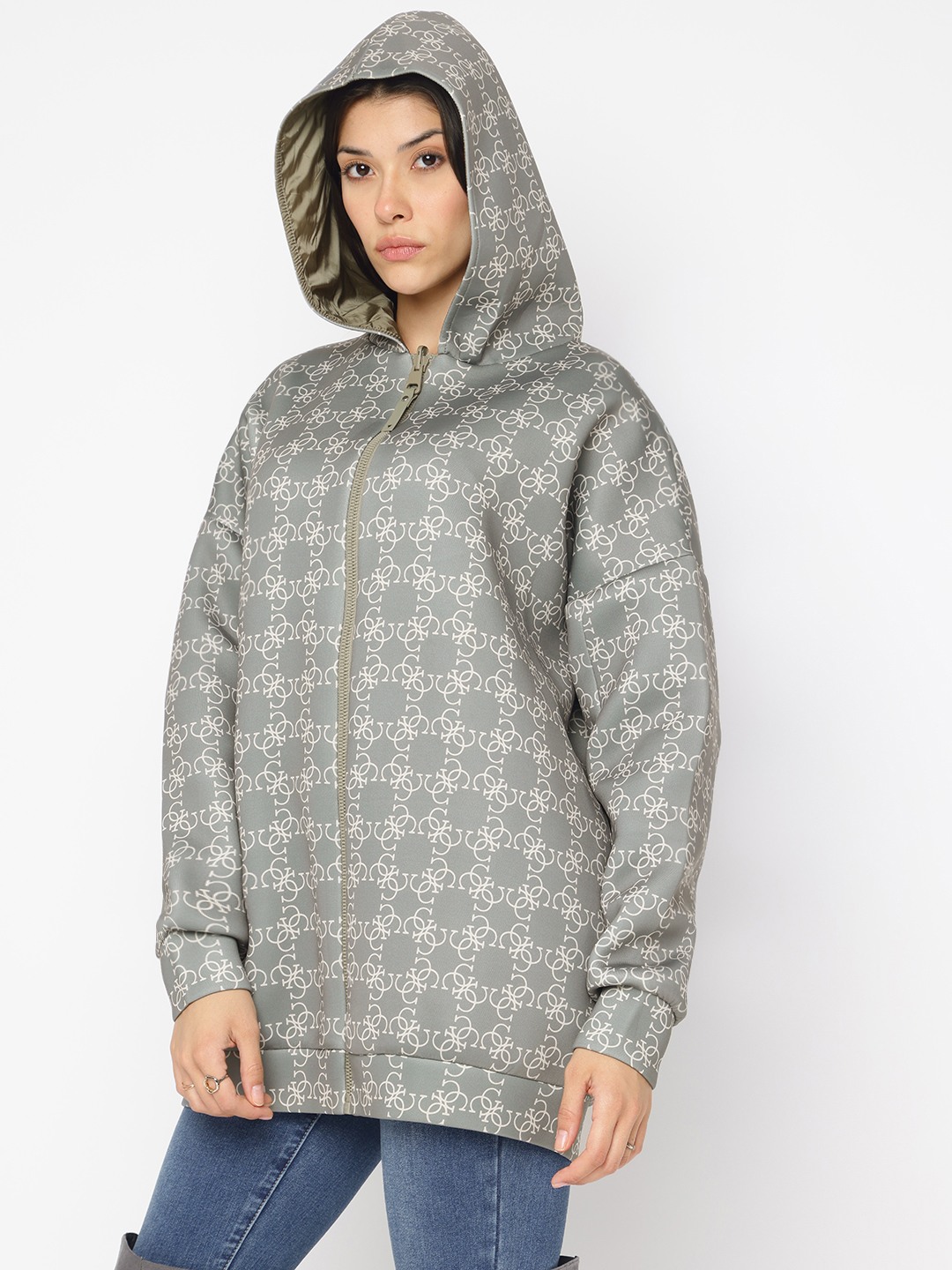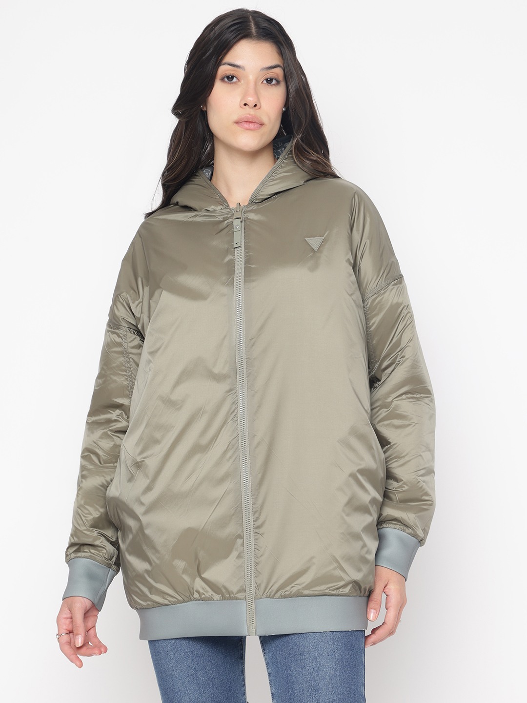 Introducing our versatile reversible jacket in a chic olive hue, designed for the modern woman who values both style and functionality. This regular-fit jacket features a trendy printed pattern, offering two looks in one. Crafted from a premium blend of 78% polyester, 15% viscose, and 7% elastane, it ensures comfort and durability. The full sleeves and practical hood provide warmth, while the zipper closure adds a sleek touch. Perfect for any occasion, this jacket effortlessly elevates your wardrobe.