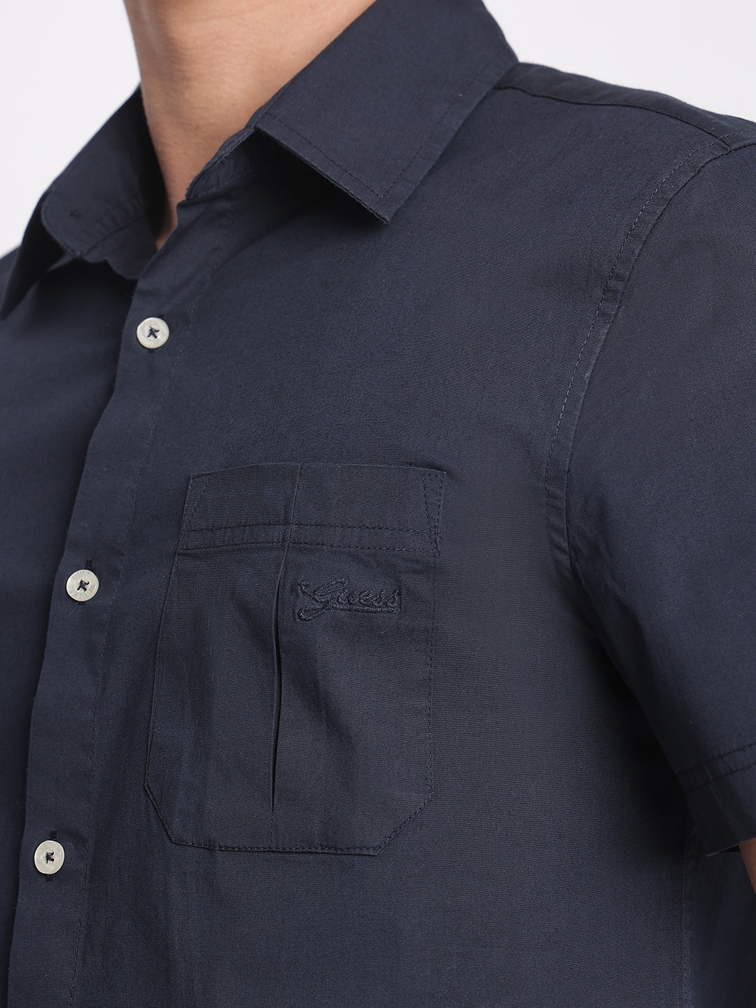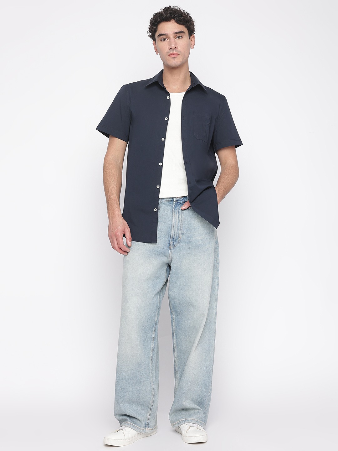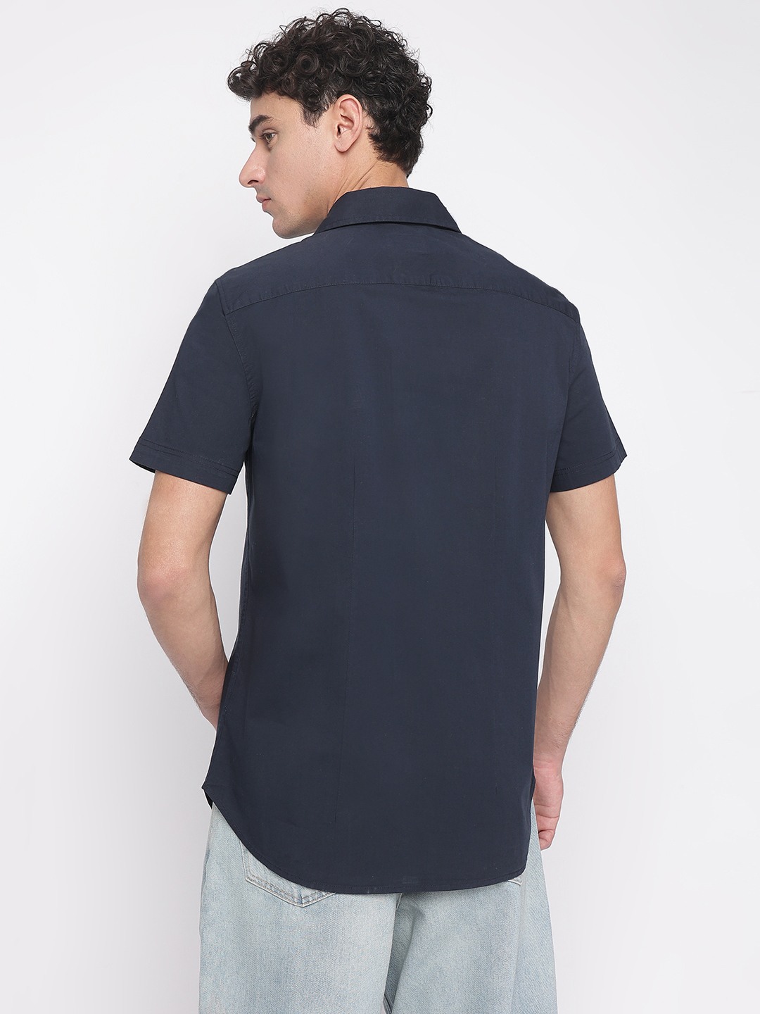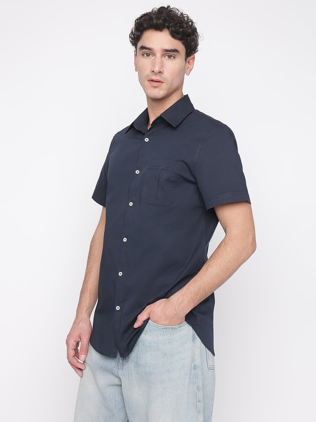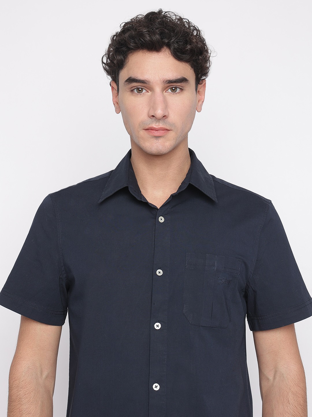 Smart Blue Solid Spread Collar Short Sleeves Shirt
