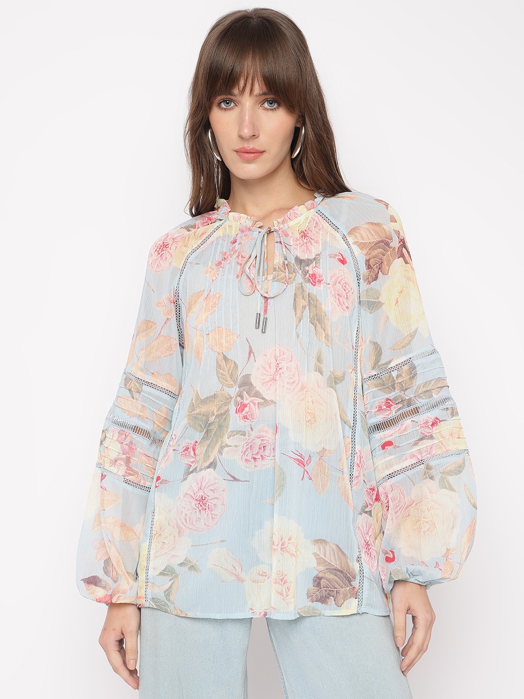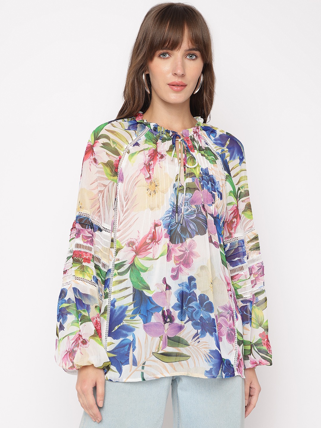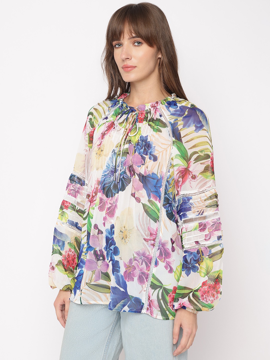Tropicalia Floral Tie-Up Neckline Full Sleeve Peasant Top