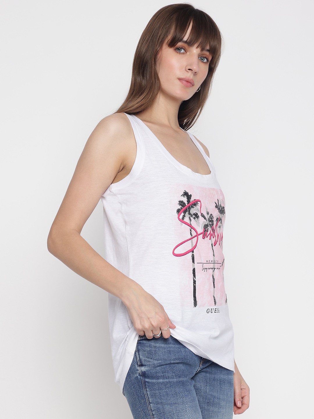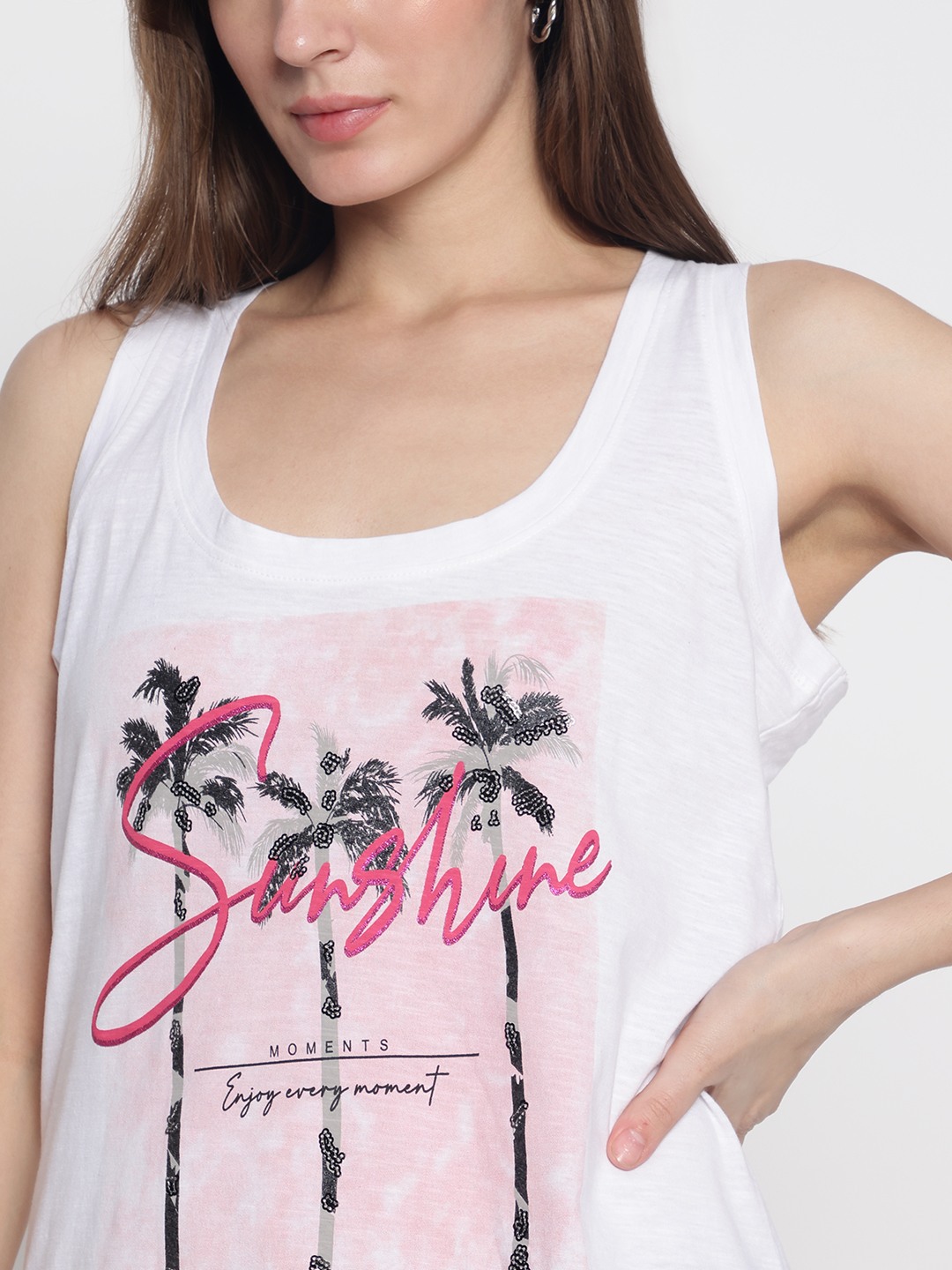 Elevate your casual wardrobe with our chic white tank top, designed for the modern woman. Featuring a regular fit and a playful printed pattern, this sleeveless essential is perfect for any occasion. The scoop neck adds a touch of elegance, while the 98% polyester and 2% elastane blend ensures a comfortable, flexible fit. With its easy pull-on closure, this tank top is as convenient as it is stylish. Pair it with your favorite jeans or a skirt for a versatile look that transitions effortlessly from day to night.