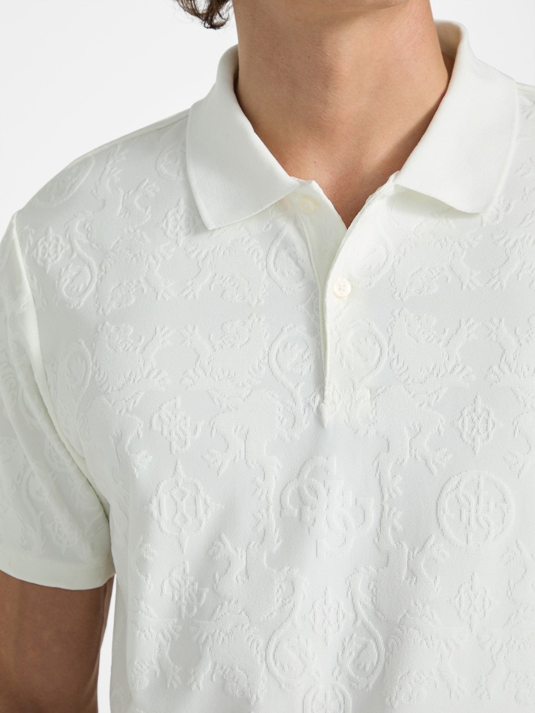 Elevate your casual style with this pristine white polo T-shirt, crafted for the modern man. Featuring a sleek self-design pattern, it adds subtle sophistication to your look. The regular sleeves and classic polo neck offer timeless appeal, while the short sleeves keep you cool and comfortable. Made from soft polyester fabric, it ensures durability and ease of movement. Perfect for both relaxed weekends and smart-casual outings, this versatile piece seamlessly blends comfort with refined style.