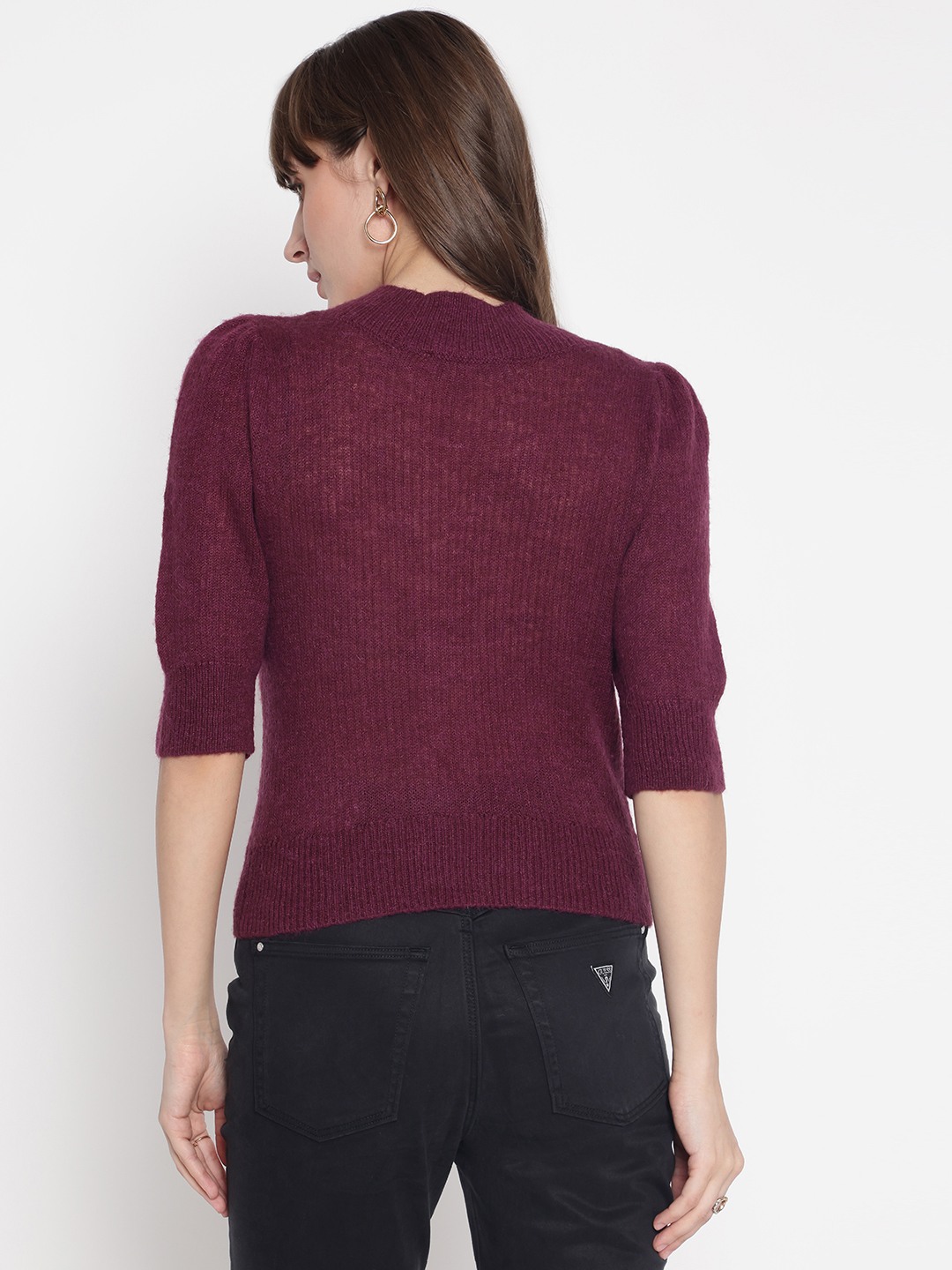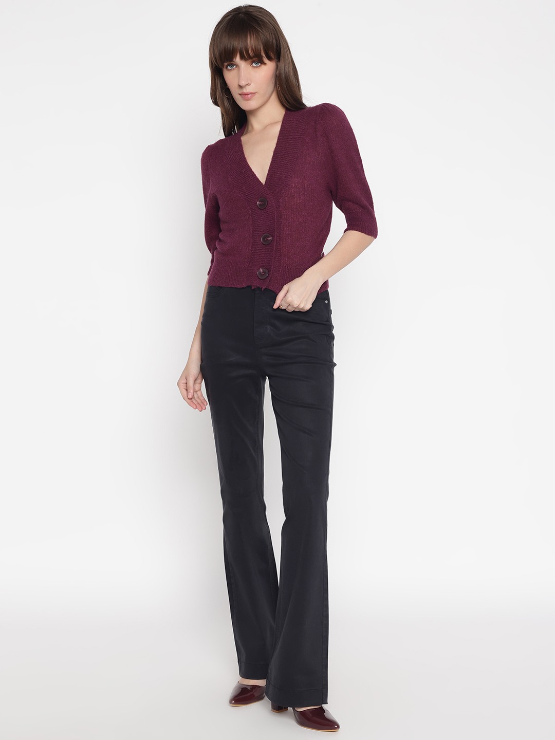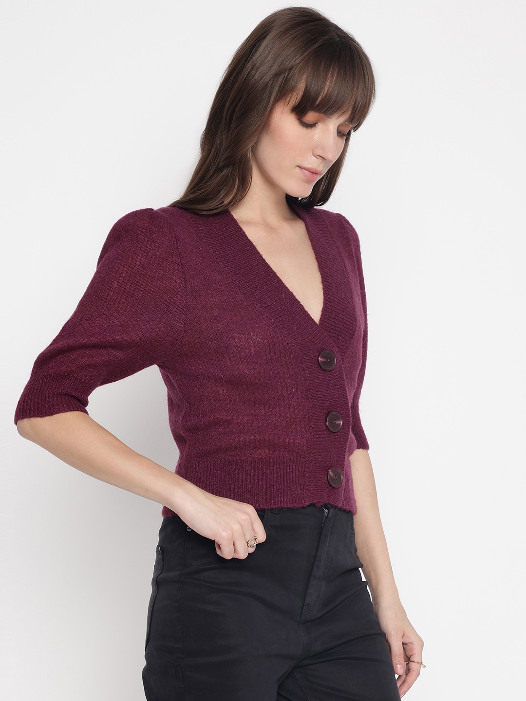 Elevate your wardrobe with our elegant wine-colored cardigan, designed for the modern woman who values both style and comfort. This regular-fit piece features a timeless solid pattern and a flattering V-neckline, perfect for layering over your favorite tops. The 3/4 sleeve design adds a touch of sophistication, while the button closure ensures a secure fit. Crafted from a luxurious blend of 45% polyamide, 25% acrylic, 15% alpaca, and 15% wool, this cardigan offers warmth and softness, making it an essential addition to your collection.