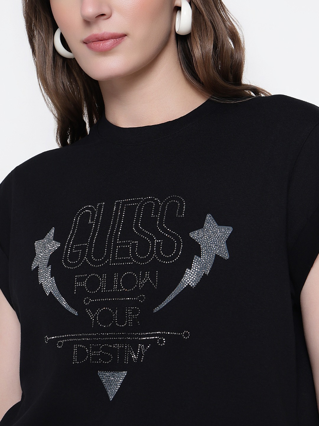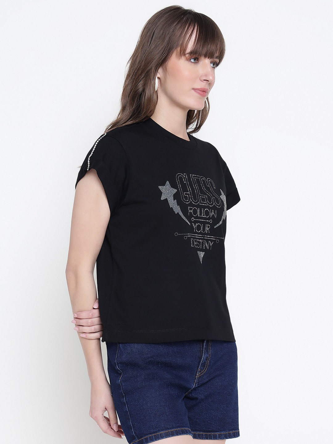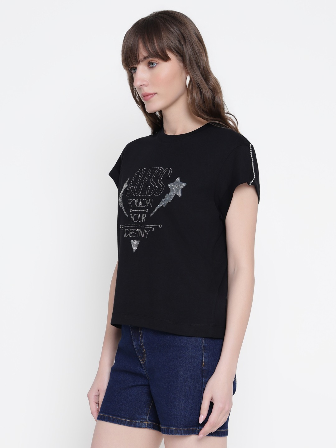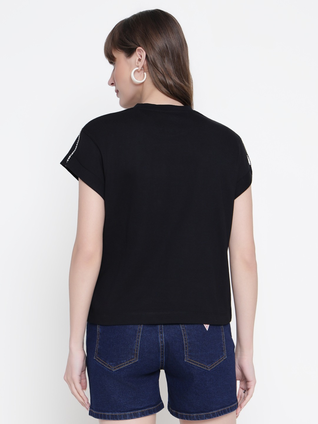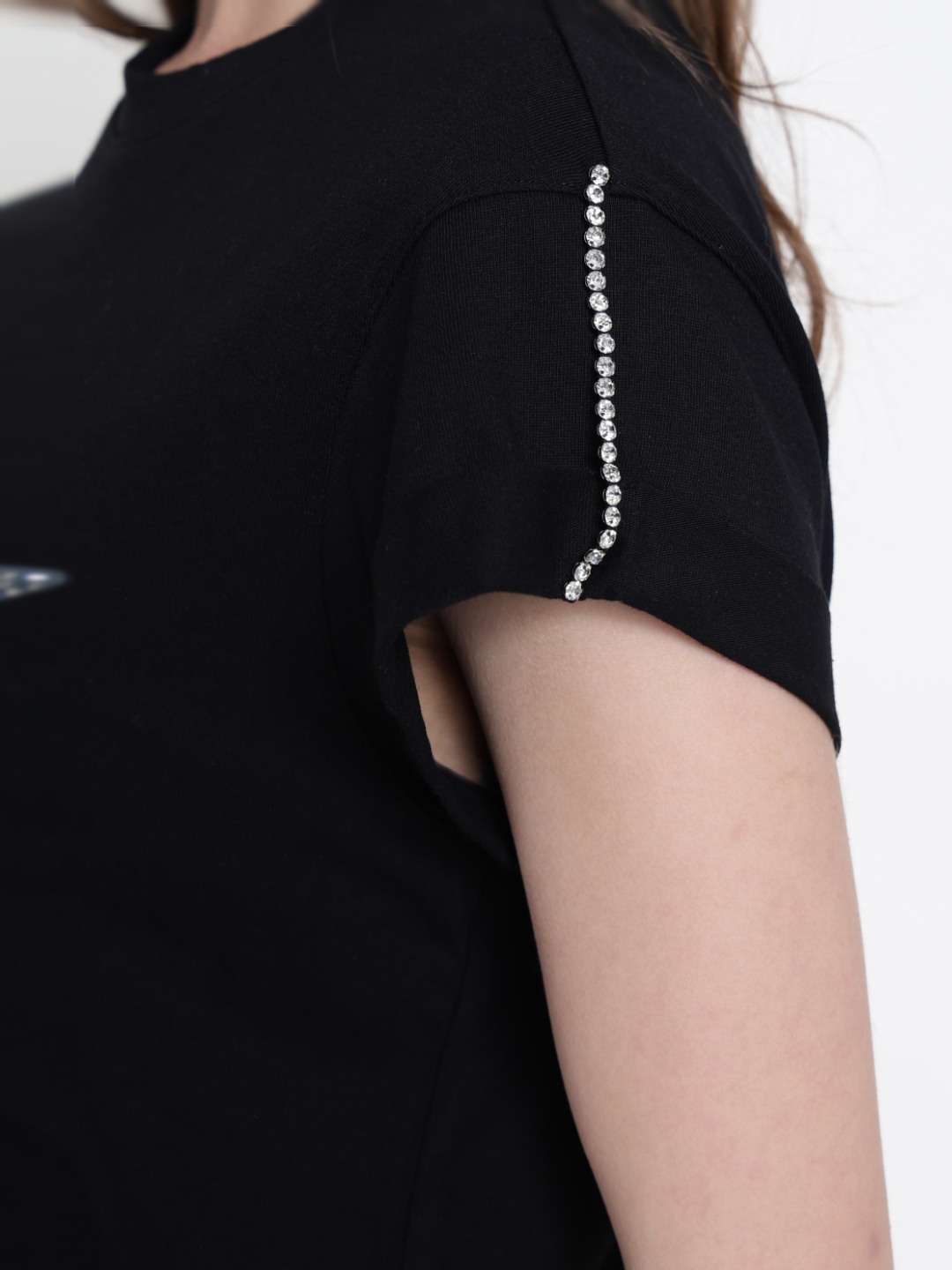 Women Black Embellished Round Neck T-shirt