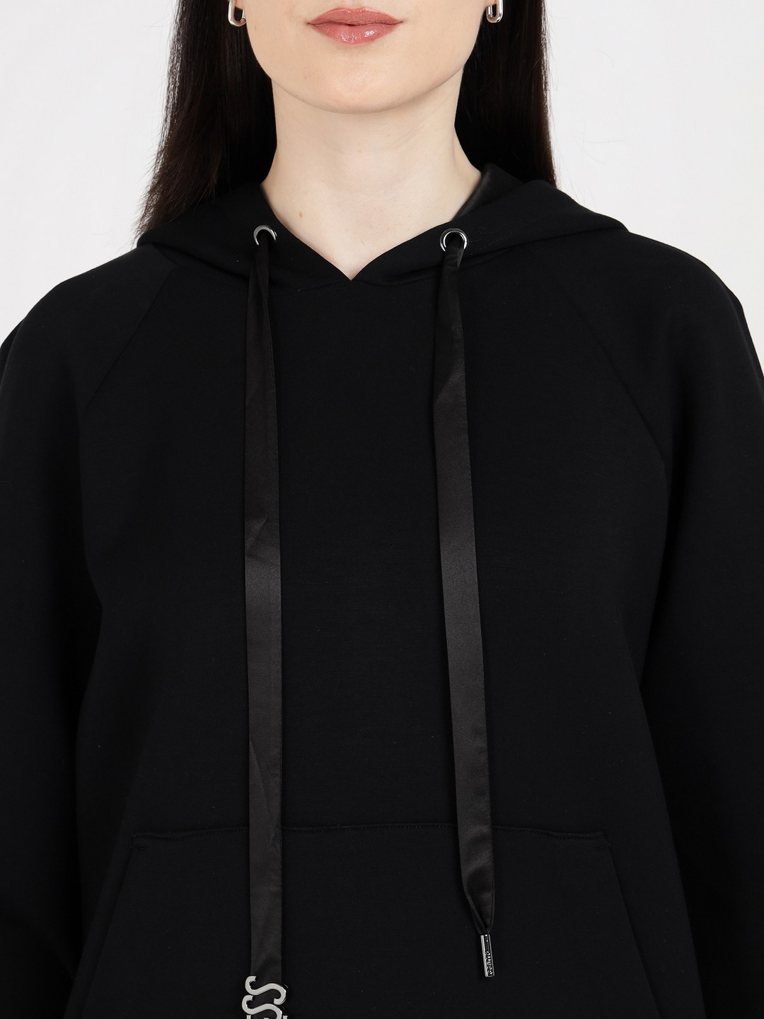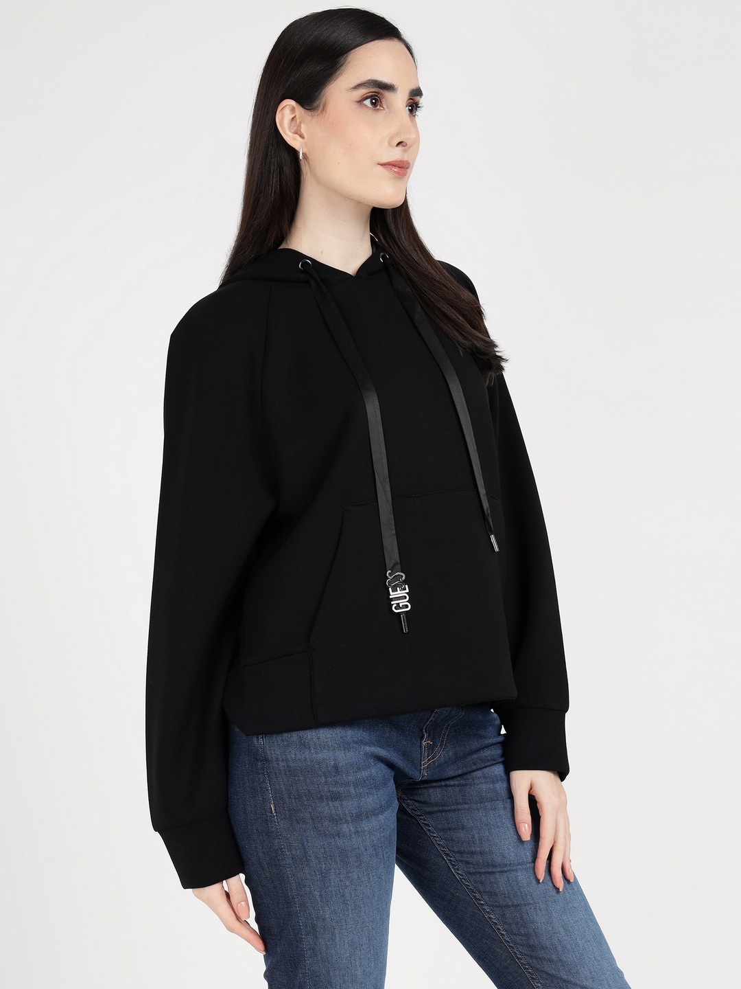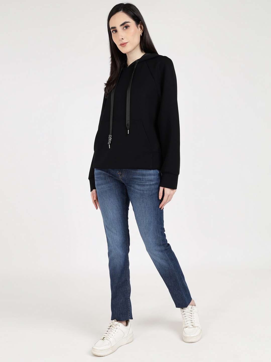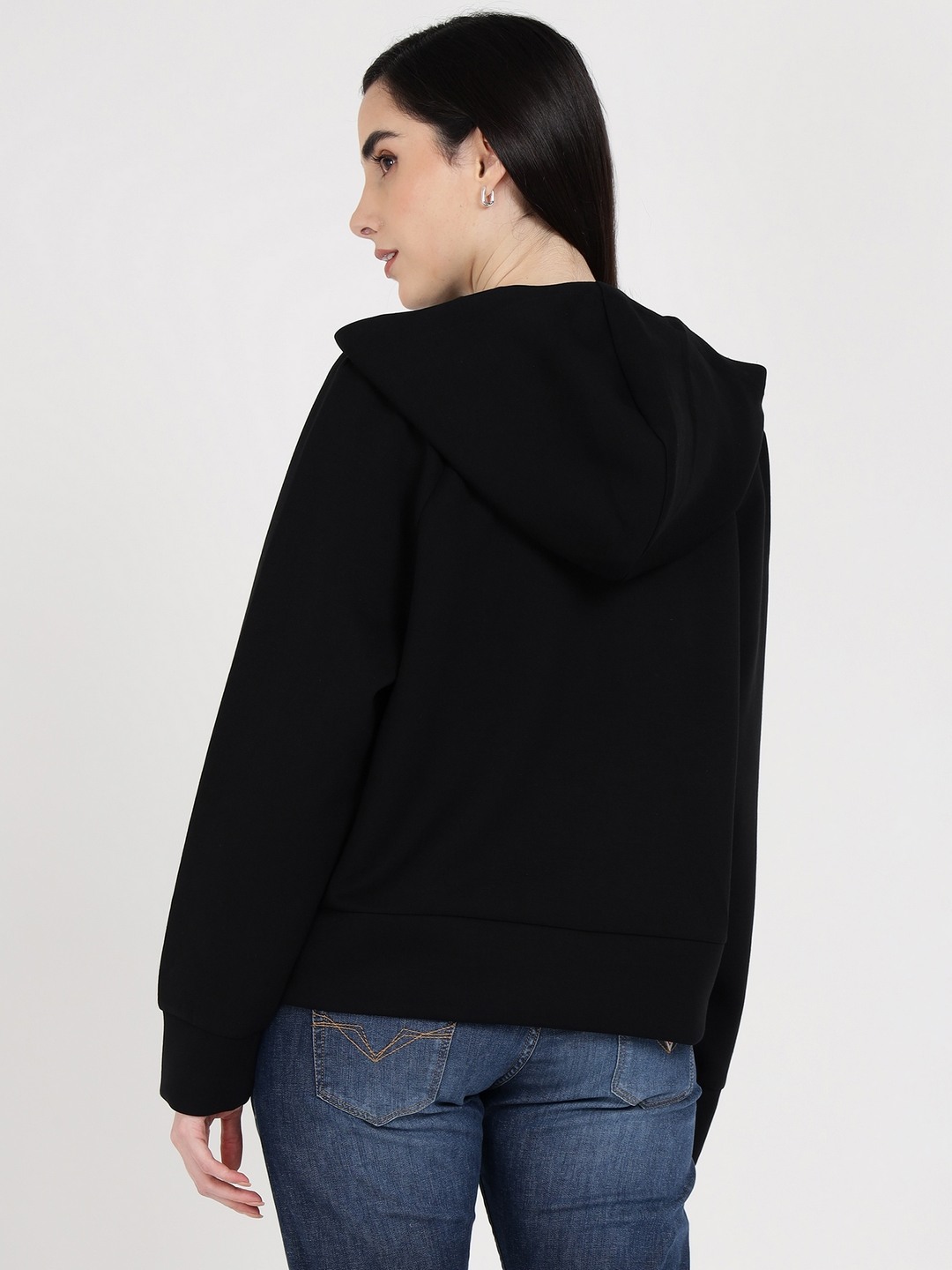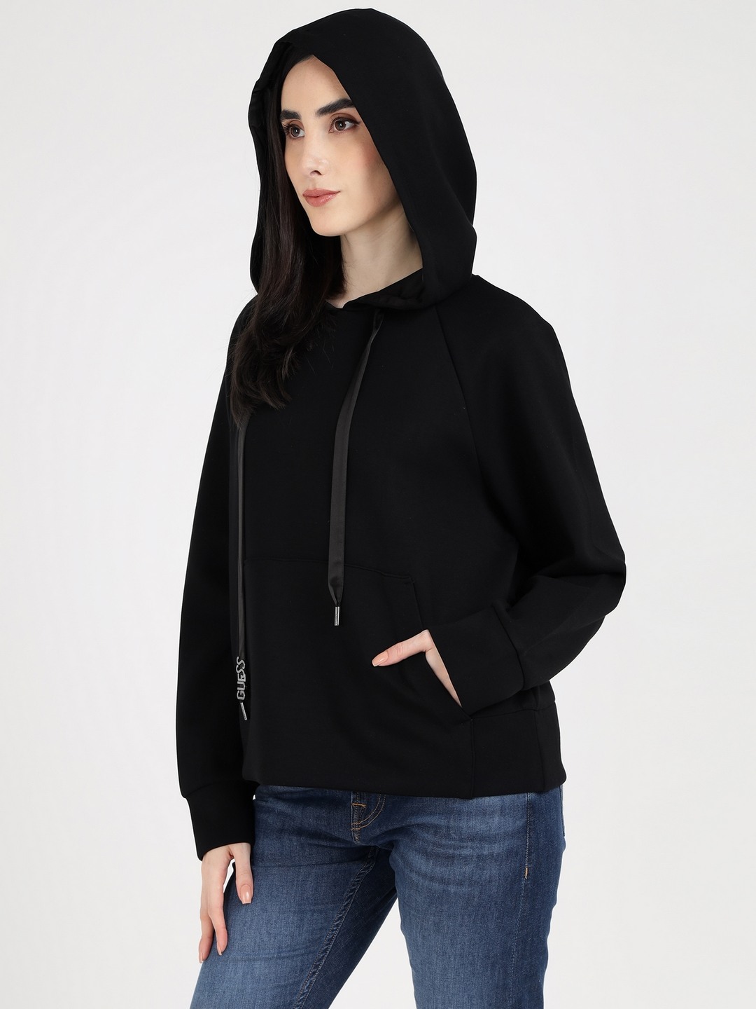 • Guess Women Black Solid Hooded Full Sleeves Pullover Style Sweatshirt