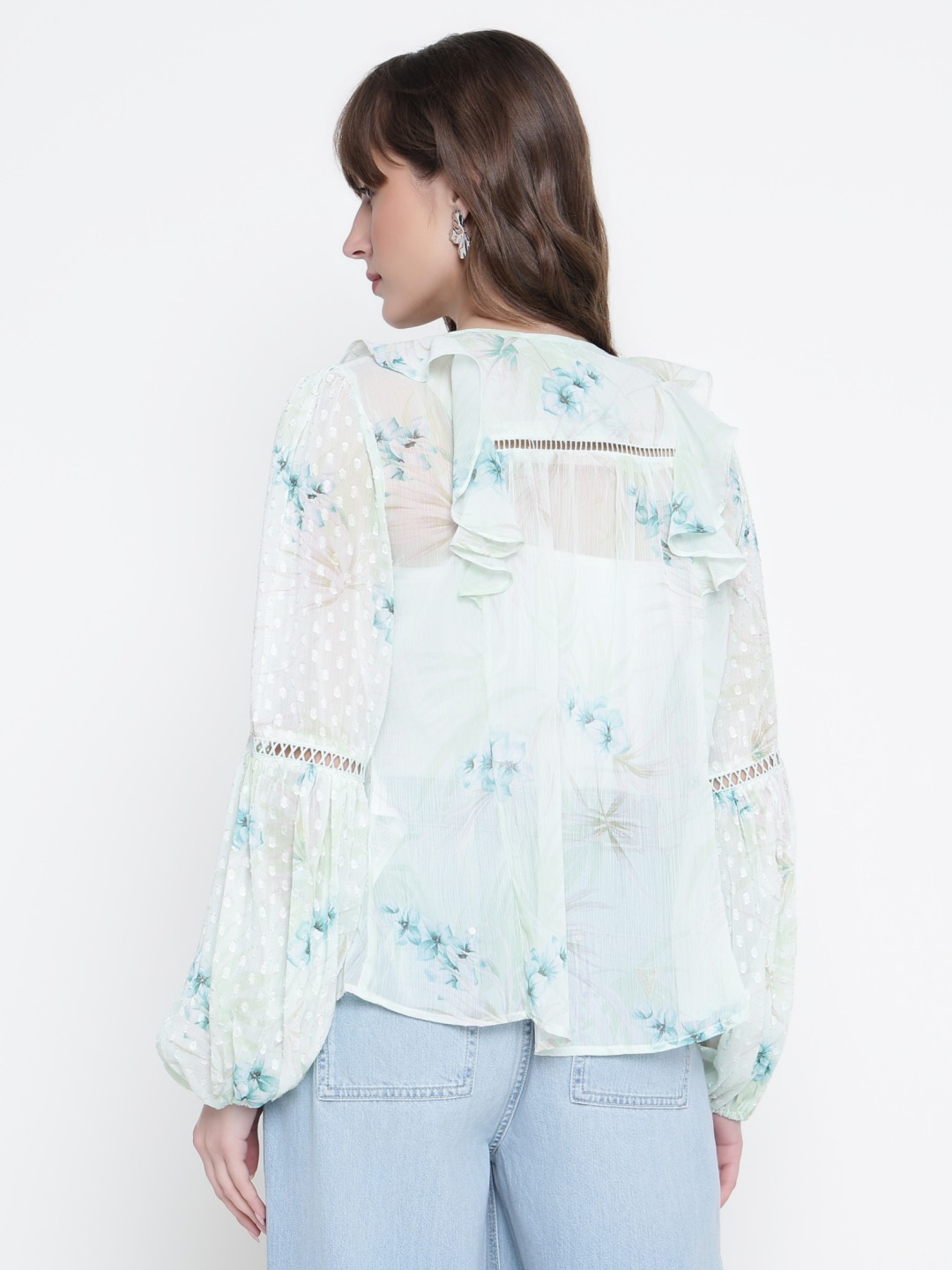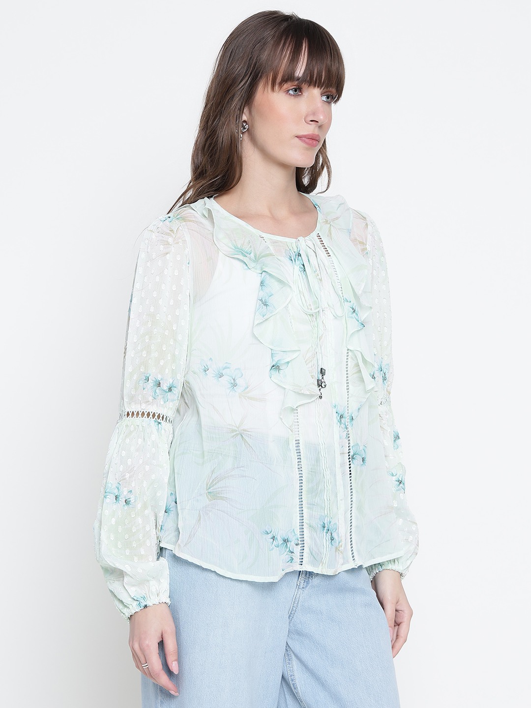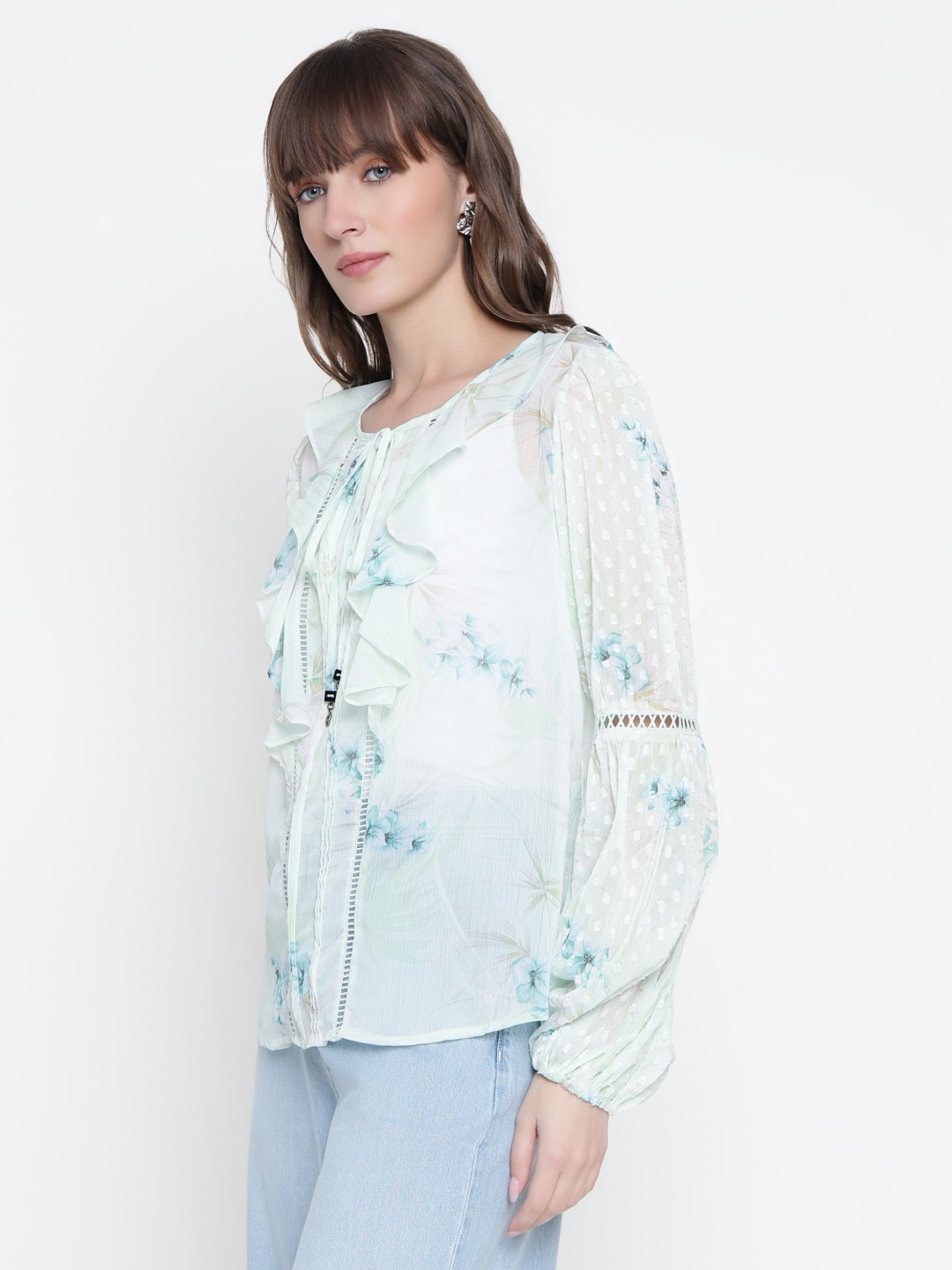 Elevate your wardrobe with this chic regular fit top, designed for the modern woman who appreciates timeless elegance. Crafted from 100% polyester, this top offers a luxurious feel and a flattering drape, ensuring comfort and style throughout the day. The enchanting floral print pattern adds a touch of femininity and sophistication, making it a versatile piece for any occasion. Featuring long sleeves, this top provides just the right amount of coverage, perfect for transitioning between seasons. The round neck design enhances its classic appeal, while the tie-up closure at the back adds a playful and adjustable element, allowing you to customize the fit to your liking. Pair it with your favorite jeans for a casual outing or dress it up with a skirt and heels for a more polished look. This floral print top is a must-have addition to your collection, offering endless styling possibilities.