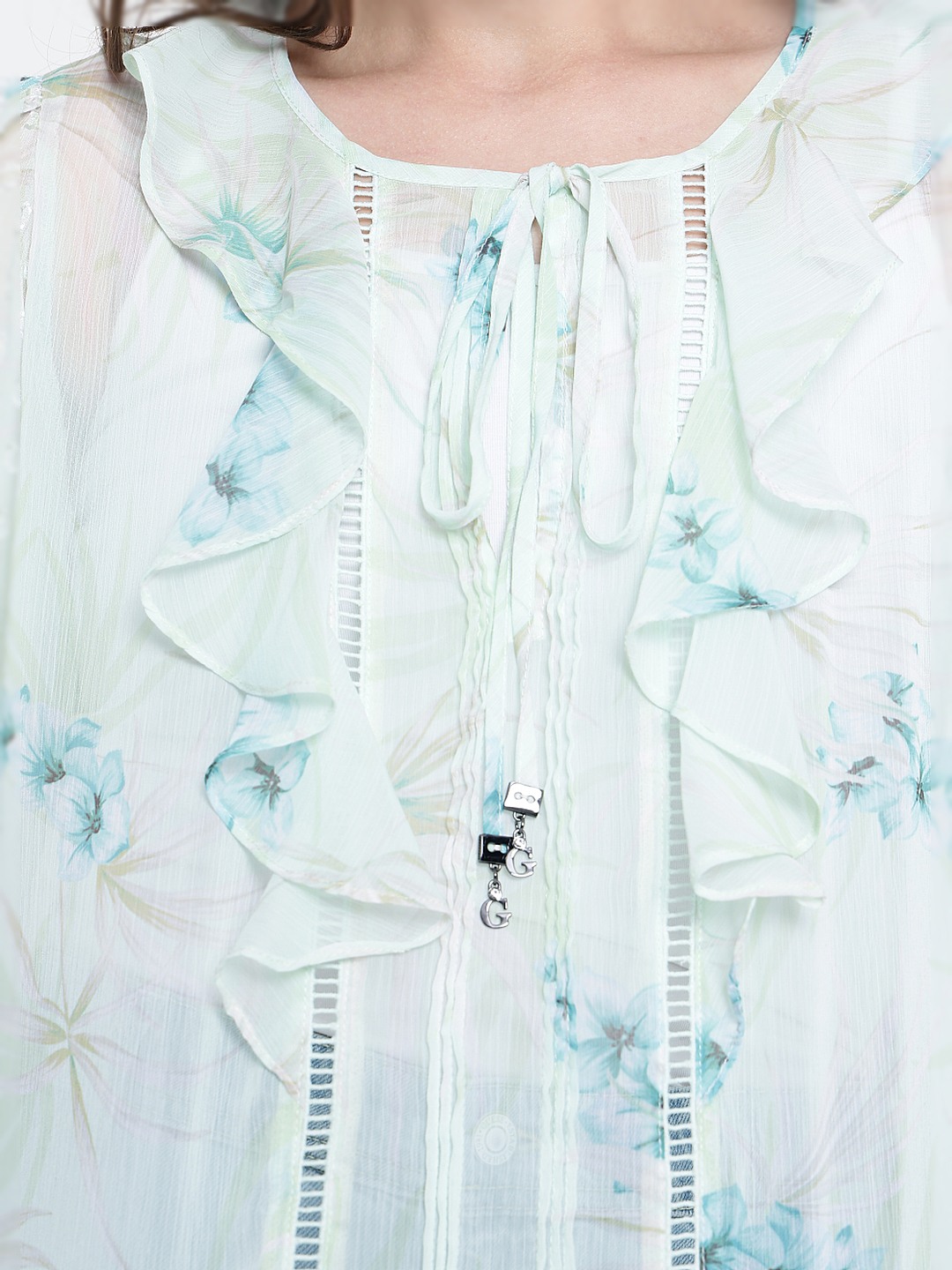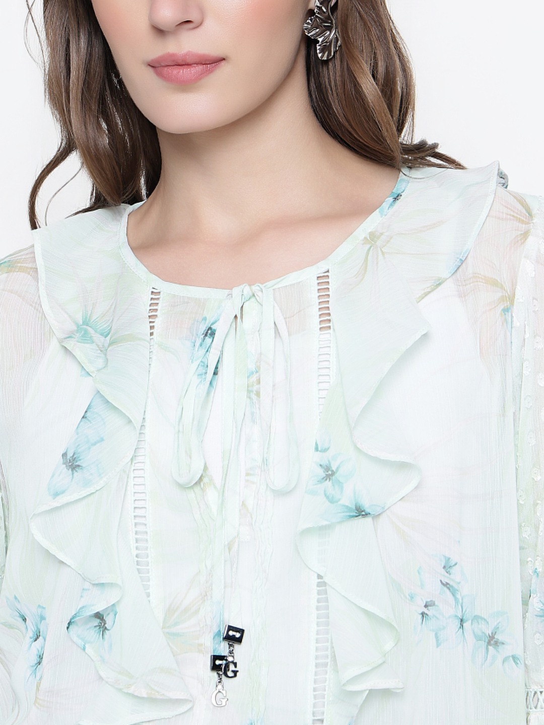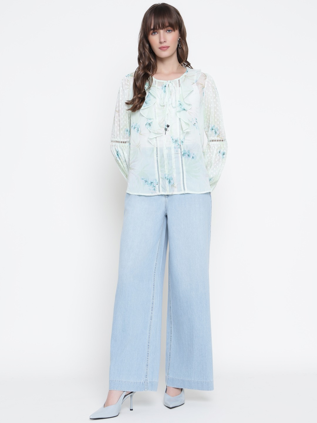 Elevate your wardrobe with this chic regular fit top, designed for the modern woman who appreciates timeless elegance. Crafted from 100% polyester, this top offers a luxurious feel and a flattering drape, ensuring comfort and style throughout the day. The enchanting floral print pattern adds a touch of femininity and sophistication, making it a versatile piece for any occasion. Featuring long sleeves, this top provides just the right amount of coverage, perfect for transitioning between seasons. The round neck design enhances its classic appeal, while the tie-up closure at the back adds a playful and adjustable element, allowing you to customize the fit to your liking. Pair it with your favorite jeans for a casual outing or dress it up with a skirt and heels for a more polished look. This floral print top is a must-have addition to your collection, offering endless styling possibilities.