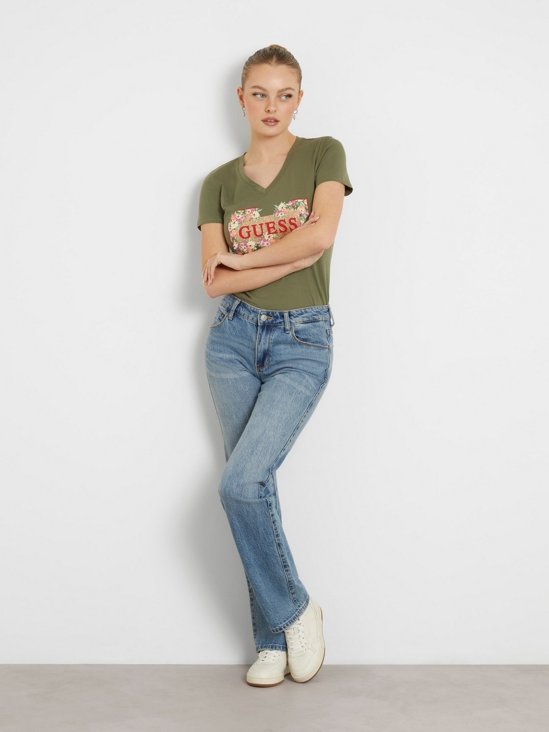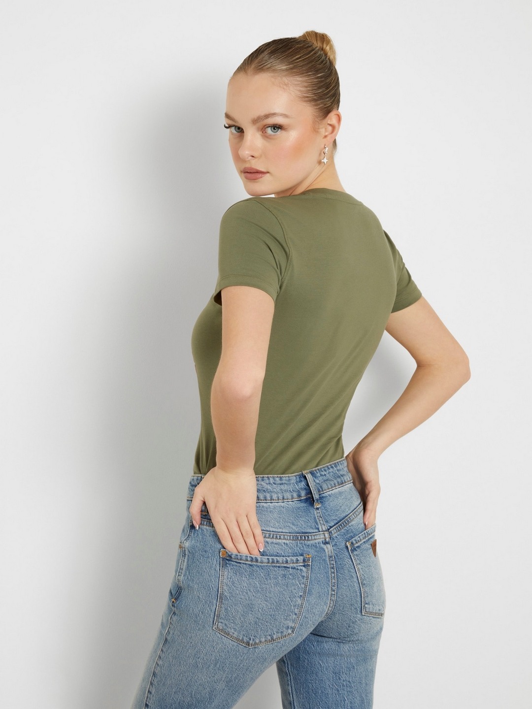 • Guess Women Olive Printed Round Neck Short Sleeves T-Shirt