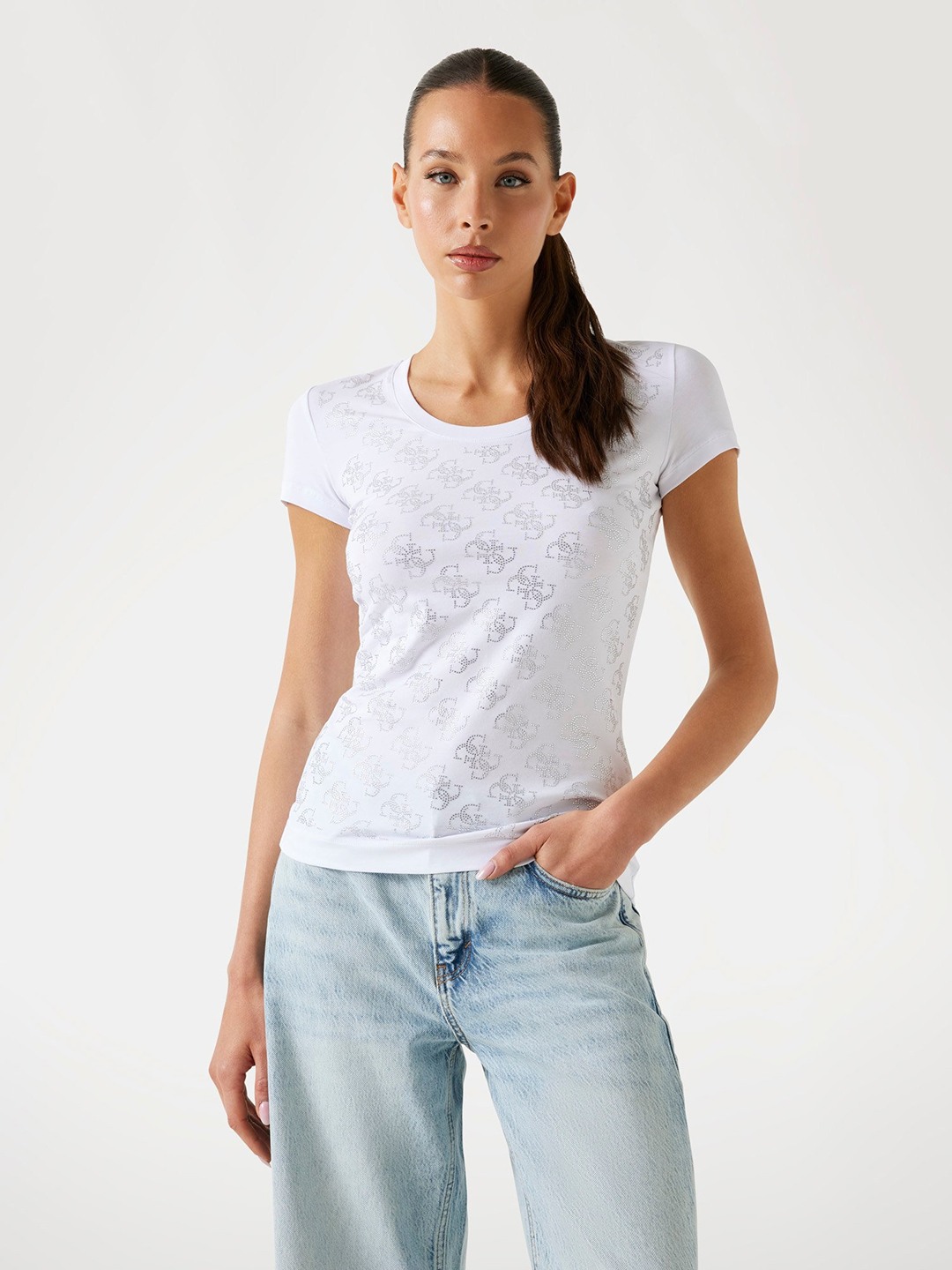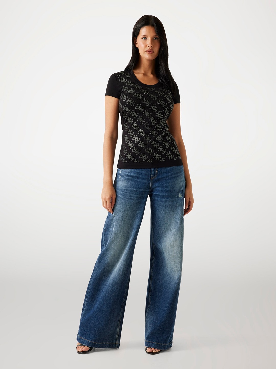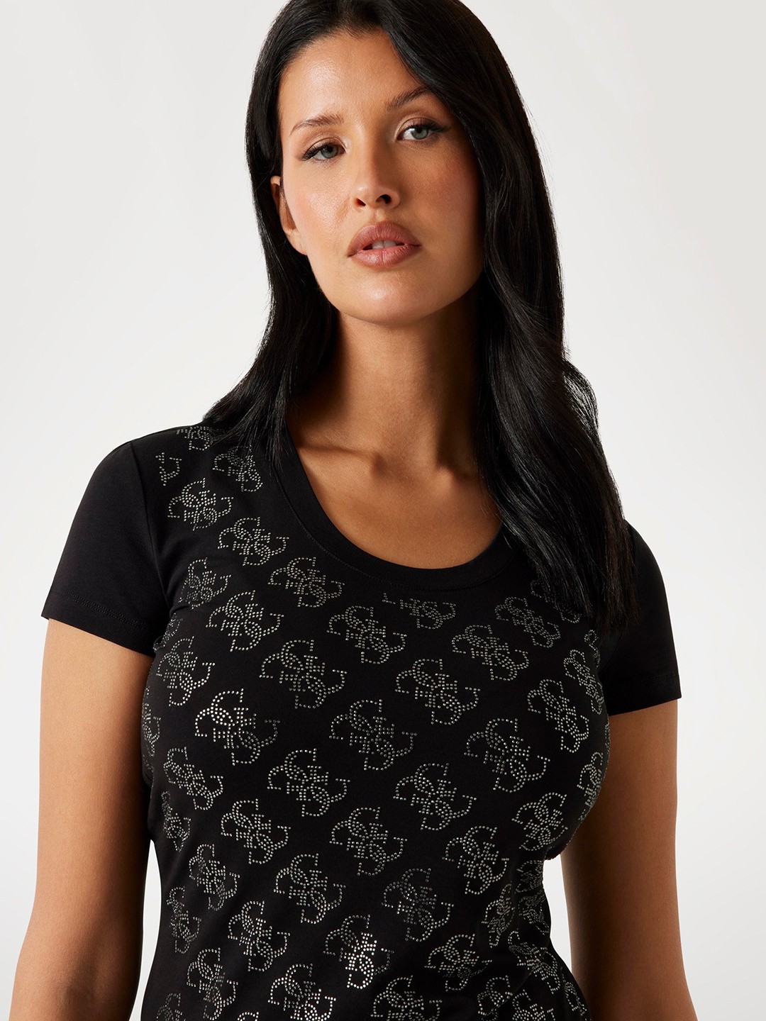 • Guess Women's Black Cotton Monogram Slim Fit T-shirt
