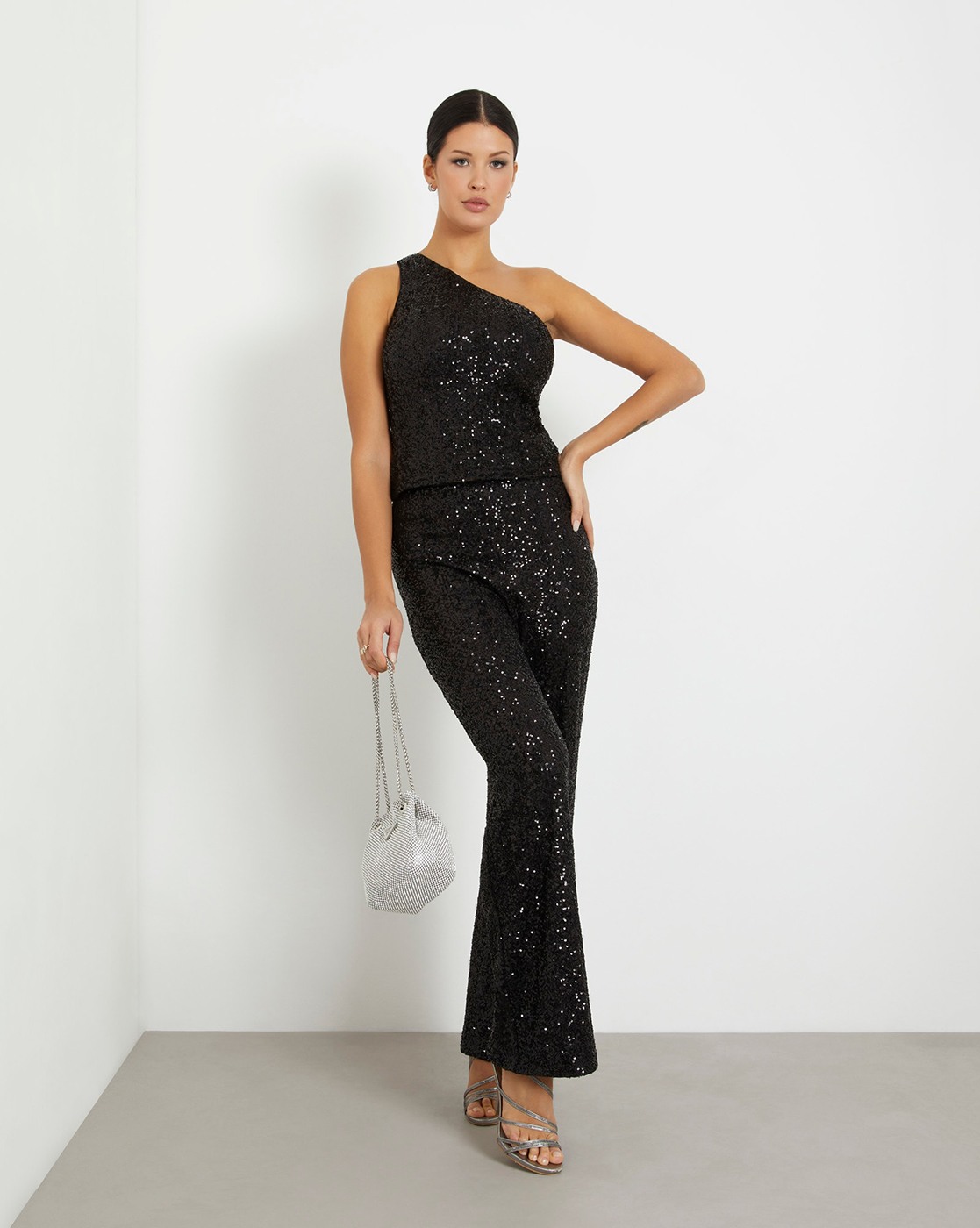 • Guess Women's Black Polyester Blend Sequin Regular Fit One Shoulder Sleeveless Top