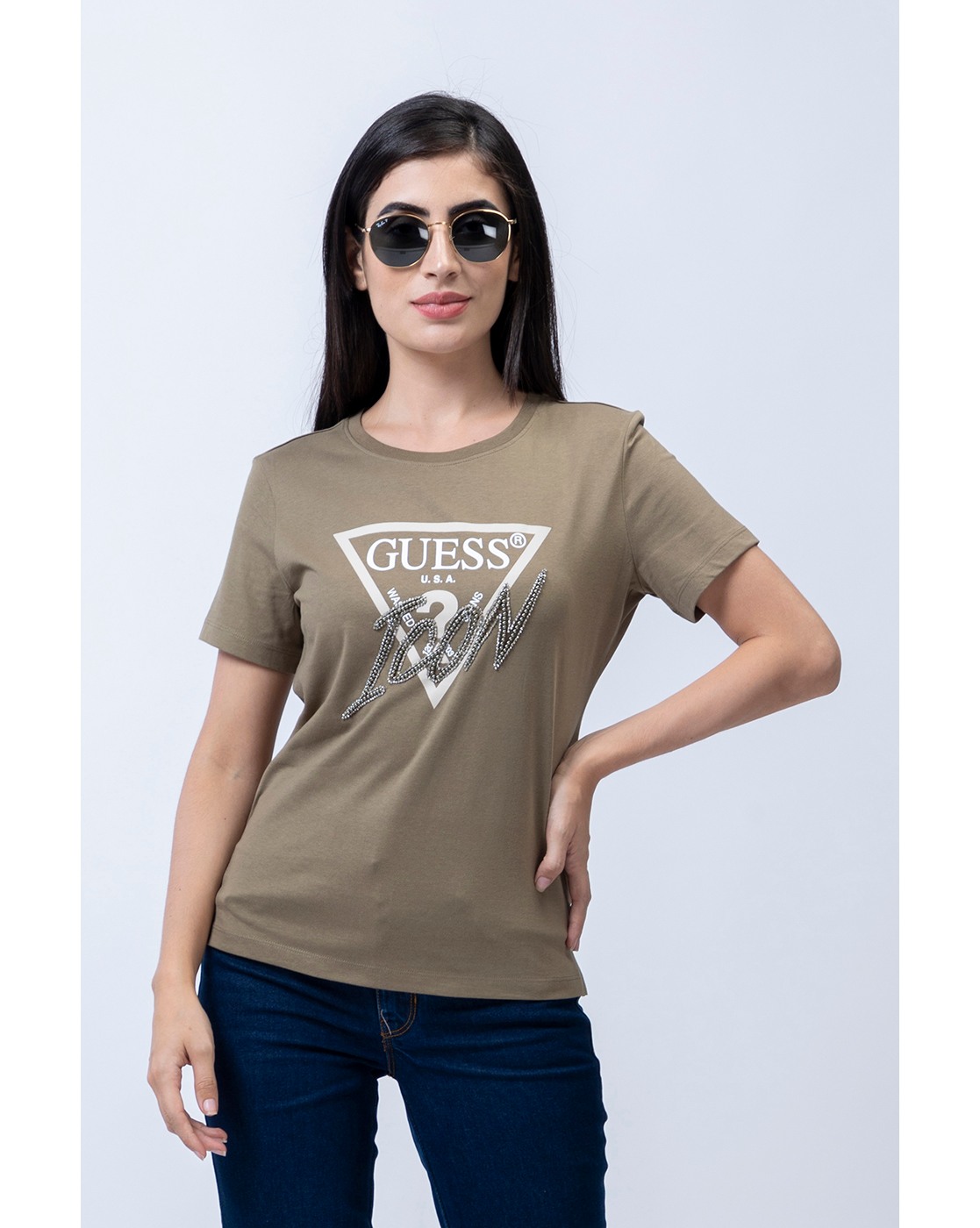 • Guess Women's Grey Melange Cotton Logo Regular Fit Half Sleeves T-shirt