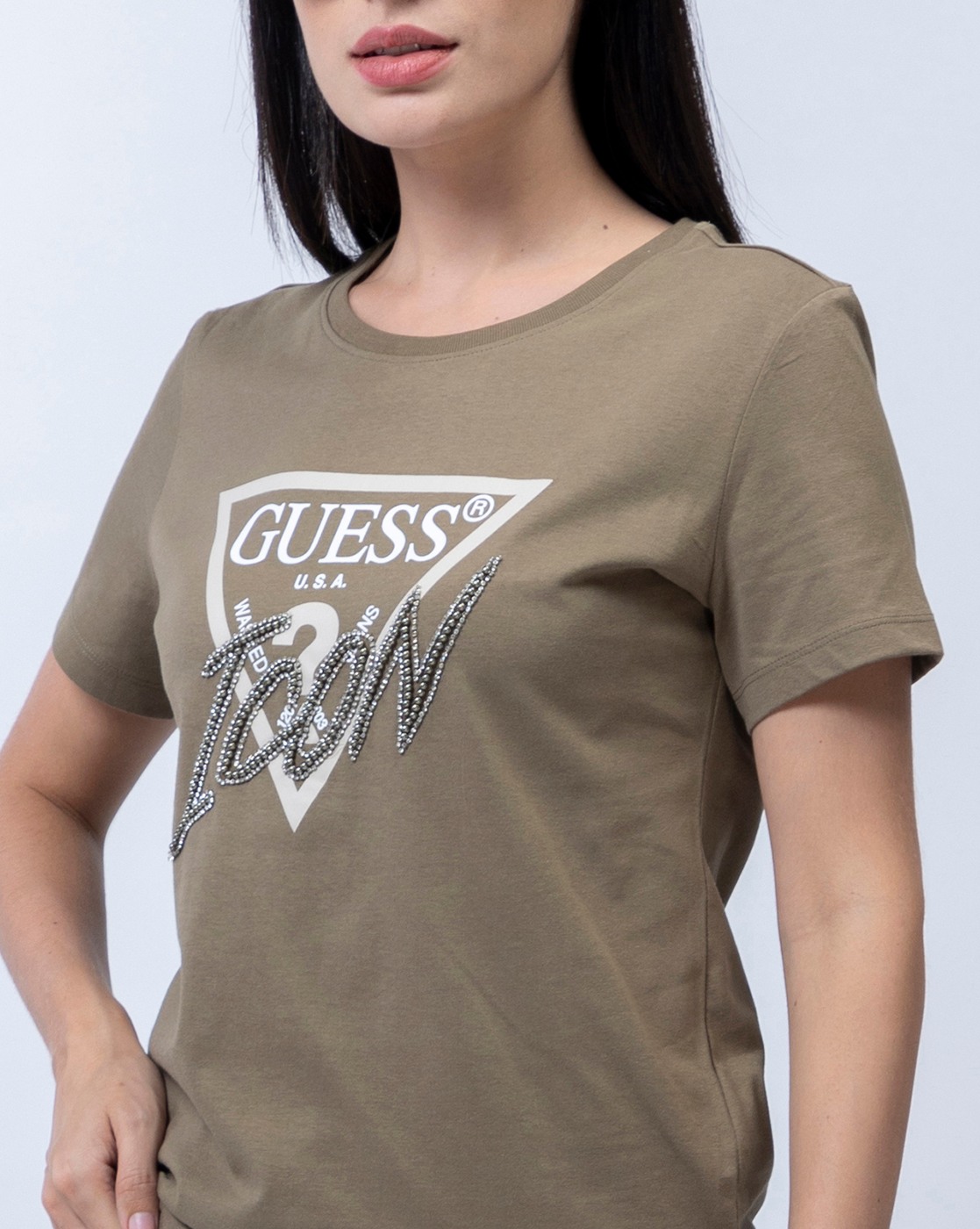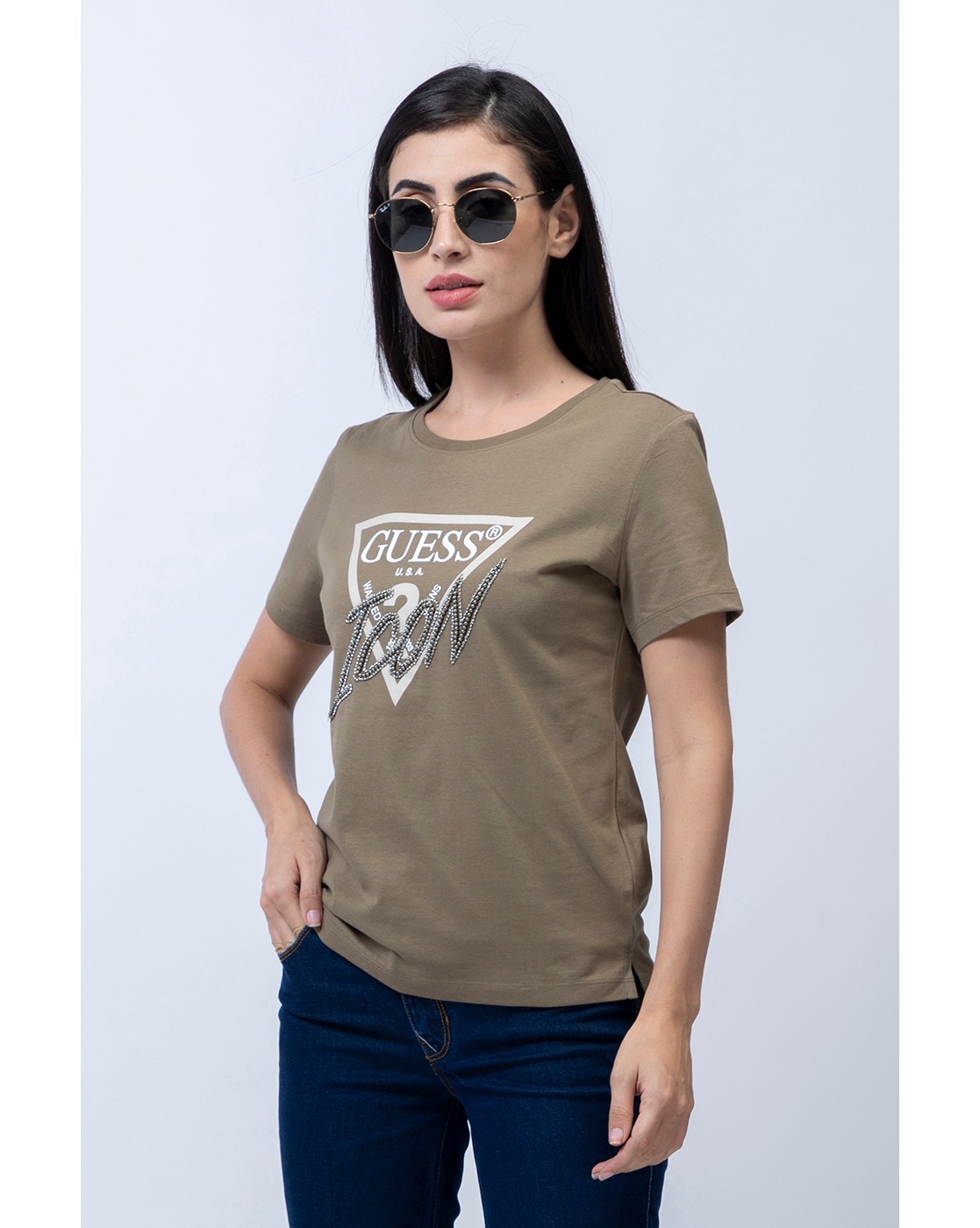 • Guess Women's Khaki Cotton Logo Regular Fit Half Sleeves T-shirt
