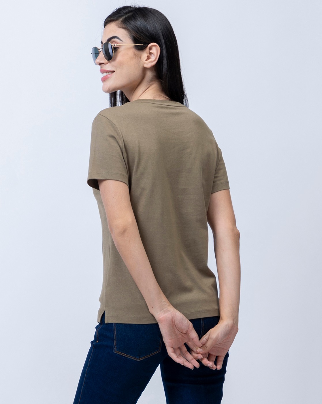 Women's Khaki Cotton Logo Regular Fit Half Sleeves T-shirt