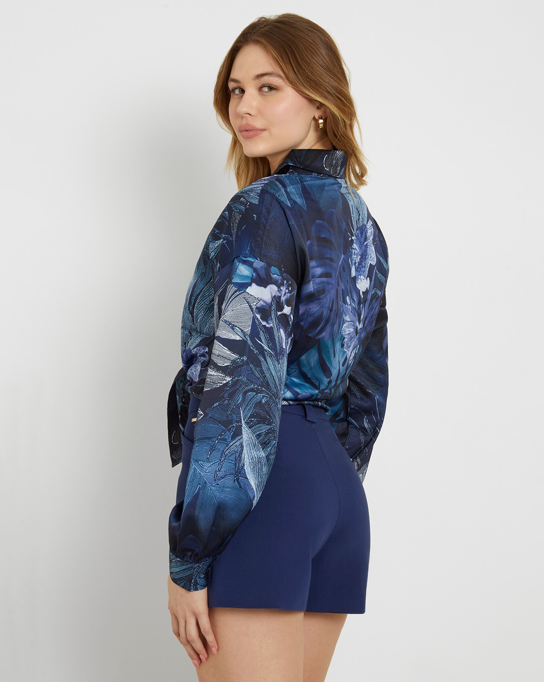 Women's Navy Blue Polyester Tropical Print Regular Fit Shirts