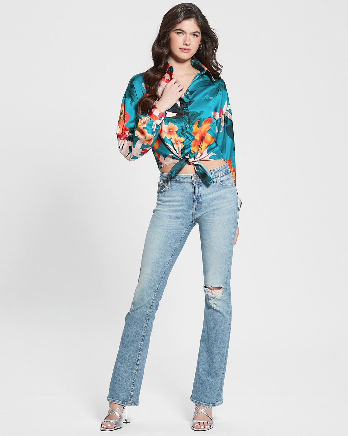 • Guess Women's Navy Blue Polyester Tropical Print Regular Fit Shirts
