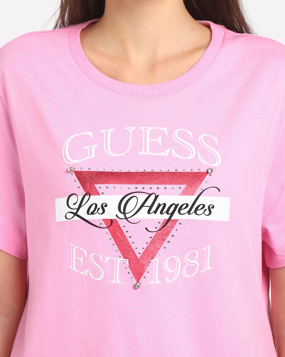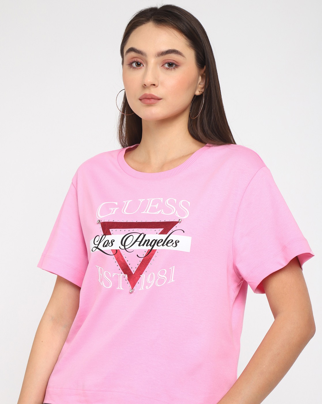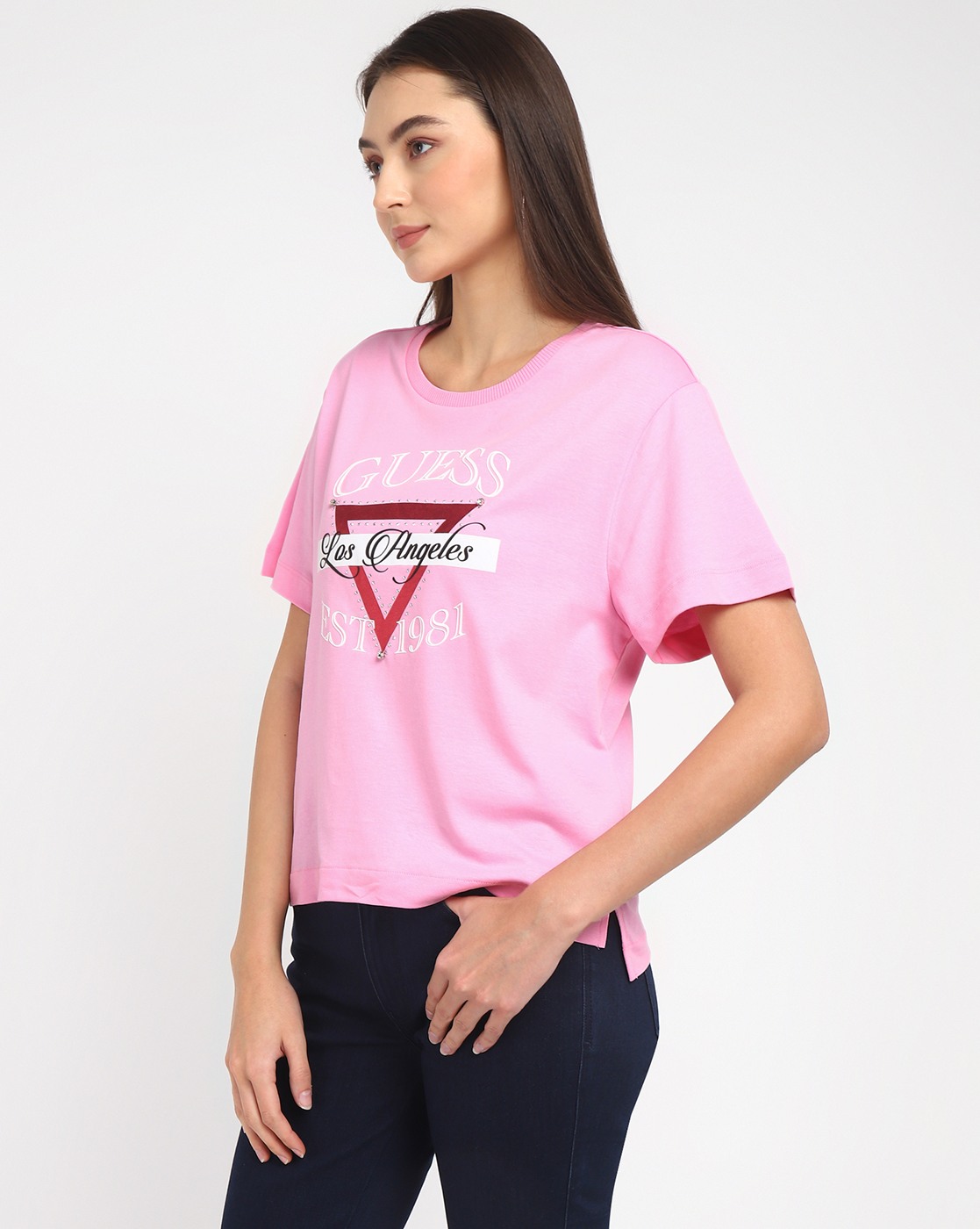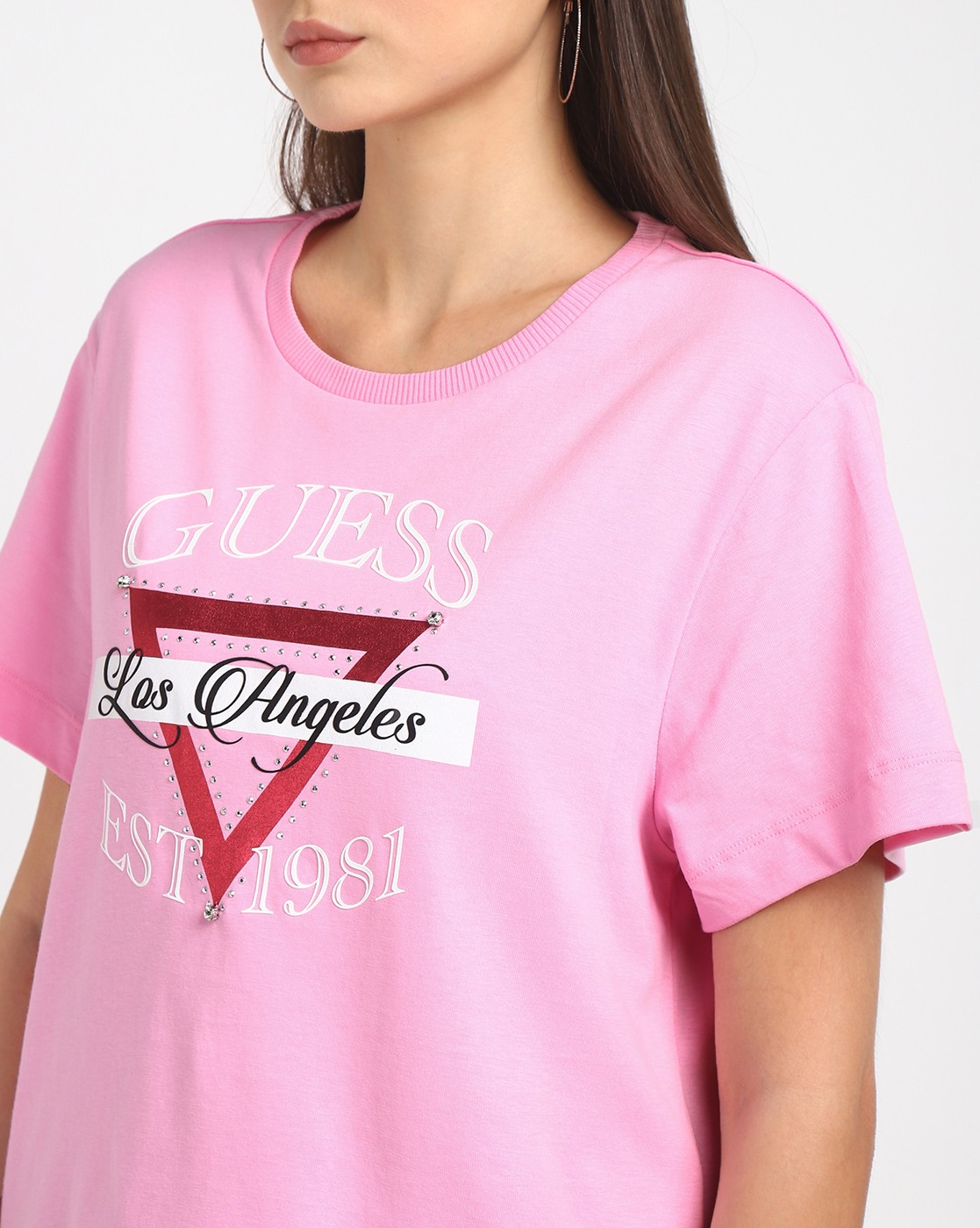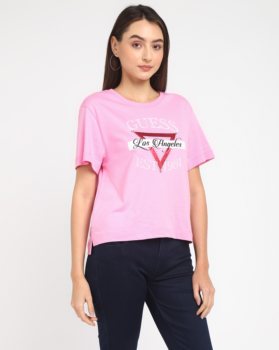 • Guess Women's Pink Cotton Logo Boxy Fit Half Sleeves T-shirt