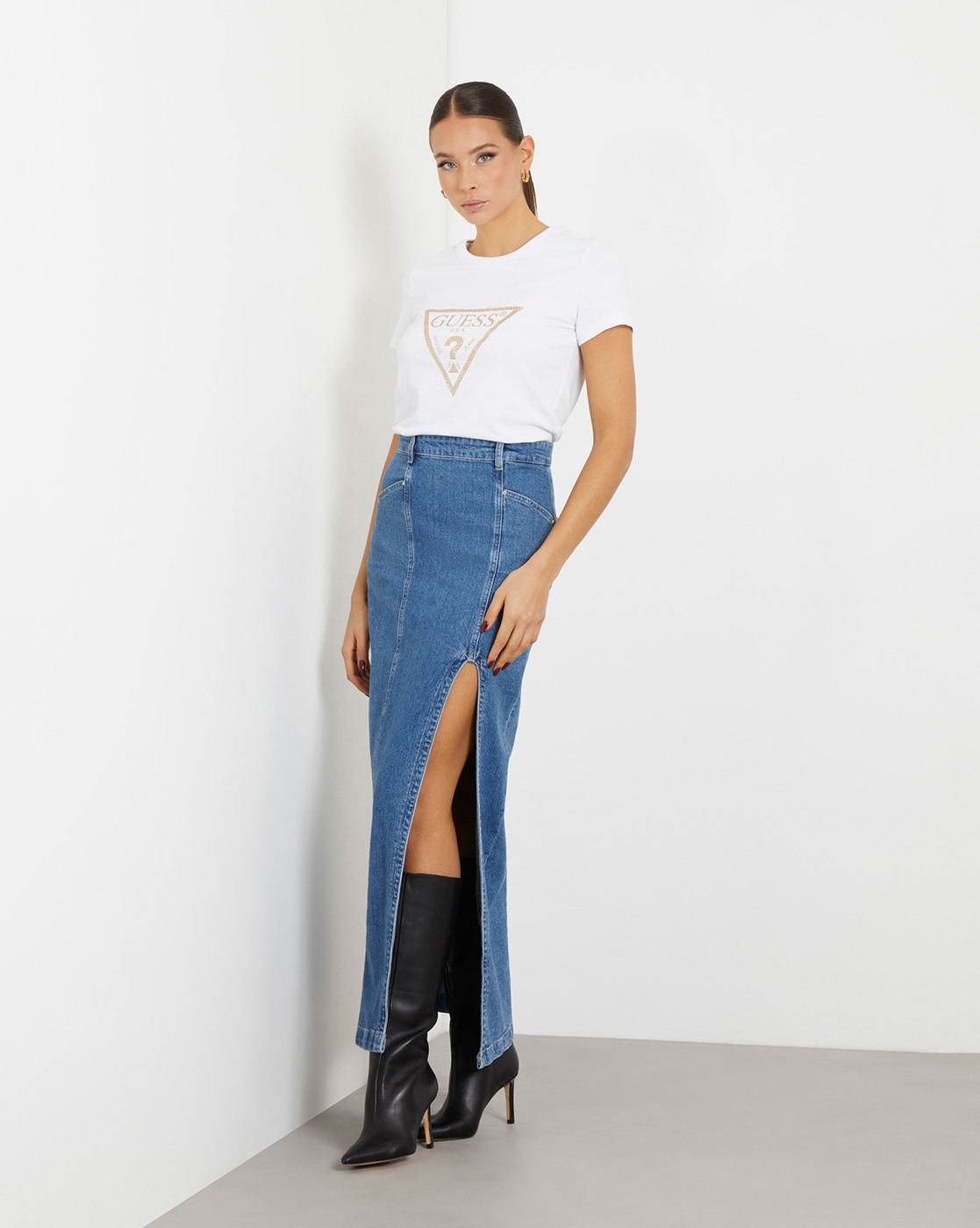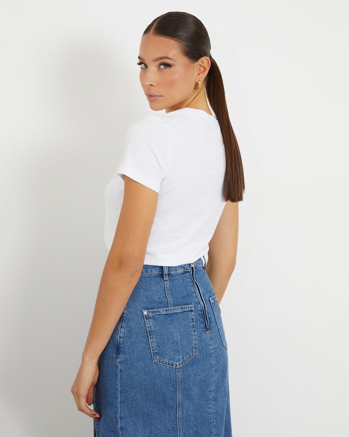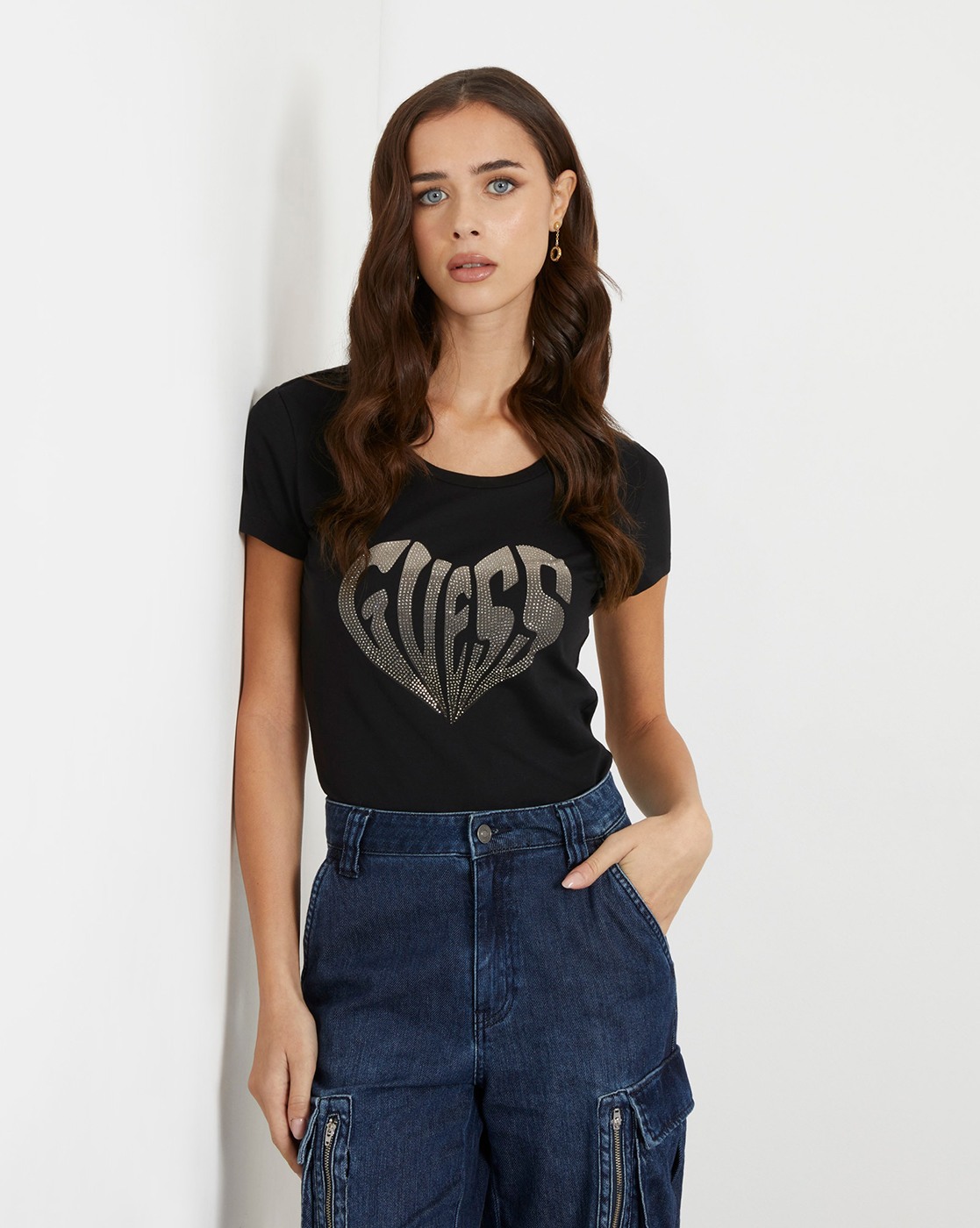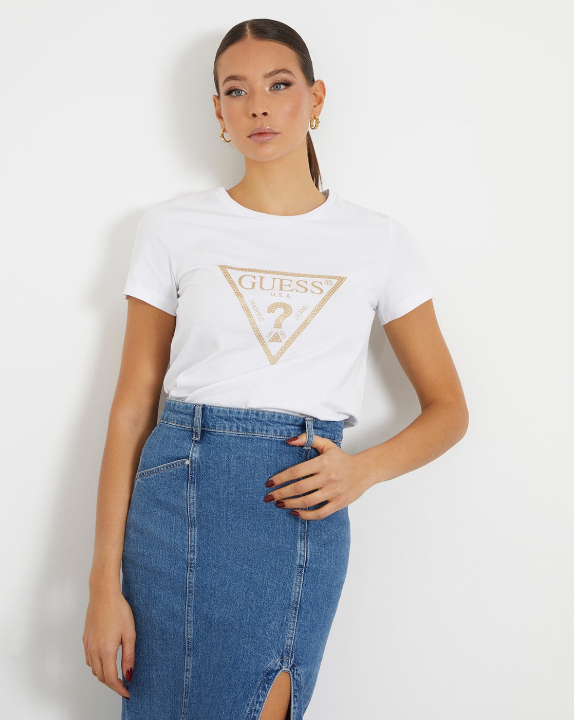 • Guess Women's White Cotton Blend Printed Regular Fit Round Neck Short Sleeve T-shirt