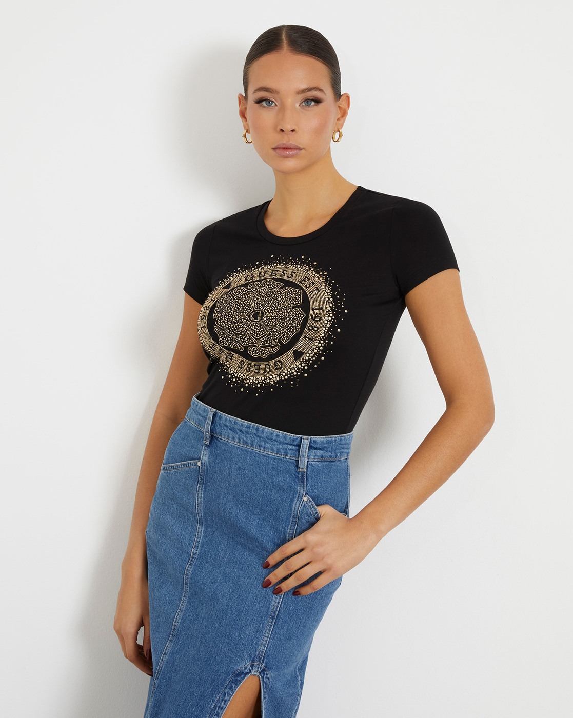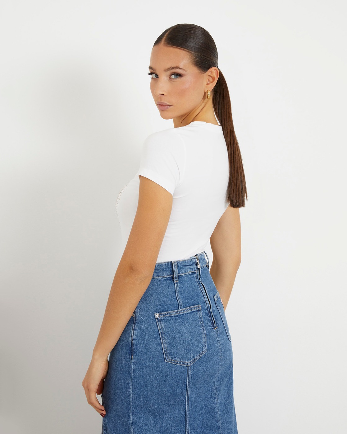 • Guess Women's White Cotton Geometric Slim Fit Half Sleeves T-shirt
